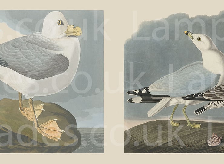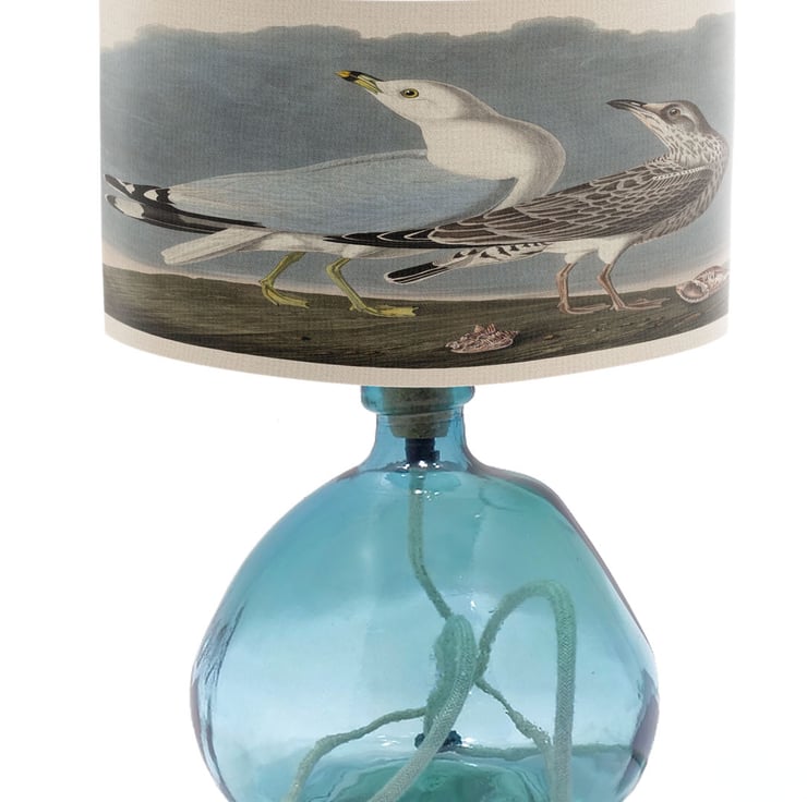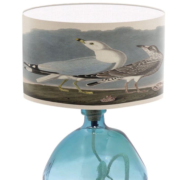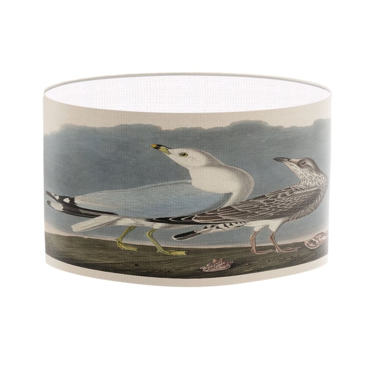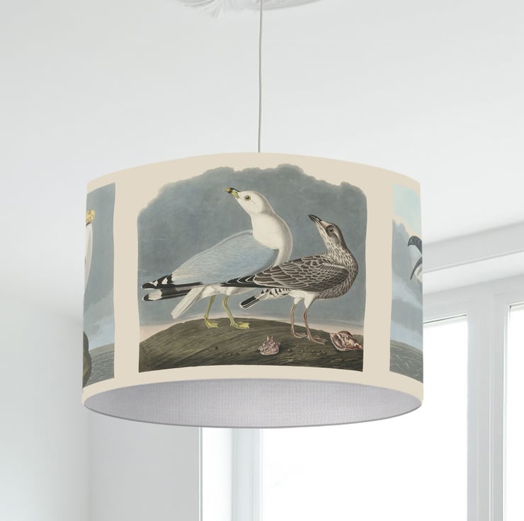 Lampshades don't have to plain and boring. Light up your room in style, color and design. This lampshade is printed with a coastal seagull illustration print.