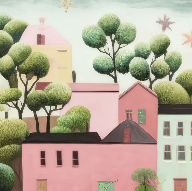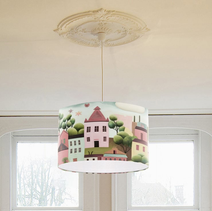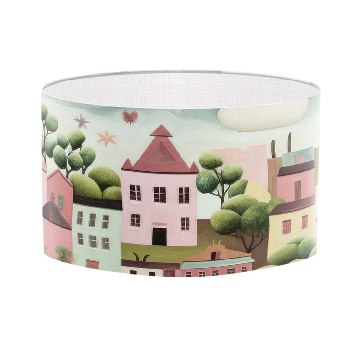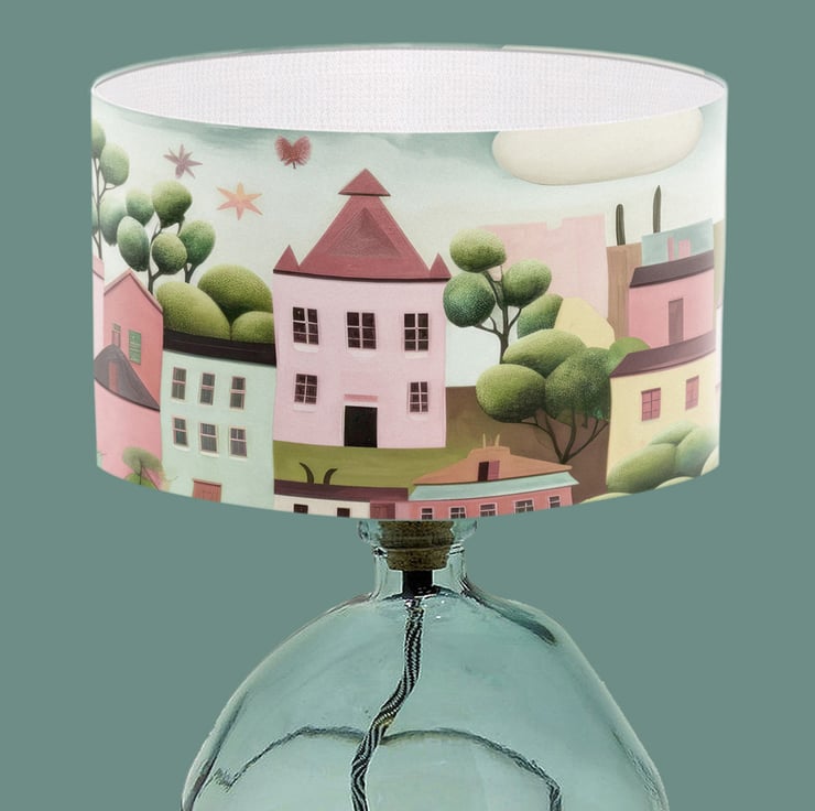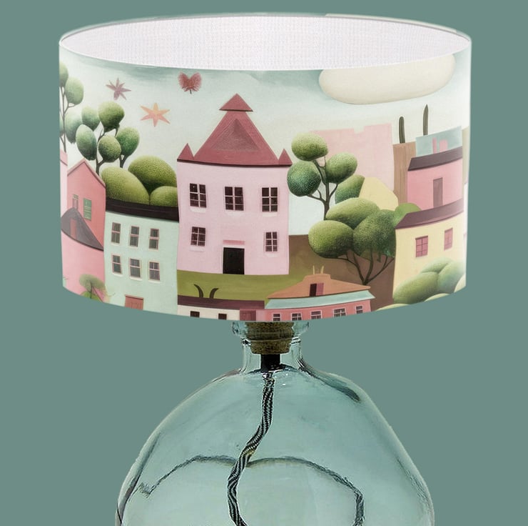 Lampshades don't have to plain and boring. Light up your room in style, color and design. This lampshade is printed with a modern illustration of Houses in pastel colours