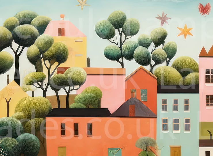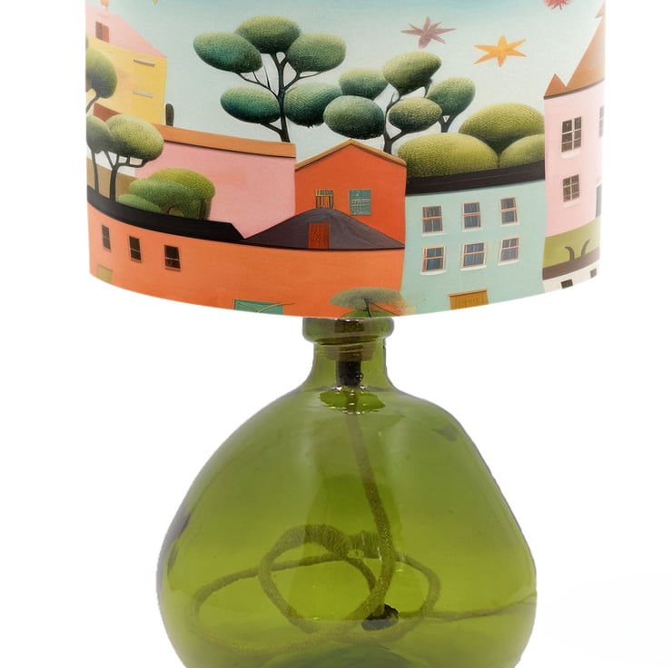 Lampshades don't have to plain and boring. Light up your room in style, color and design. This lampshade is printed with a colourful houses and trees illustration.
