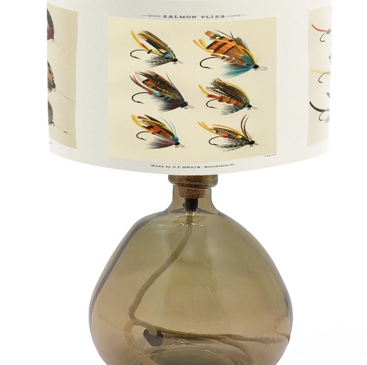 Lampshades don't have to plain and boring. Light up your room in style, color and design. This lampshade is printed with a beautiful period print of fishing flies.