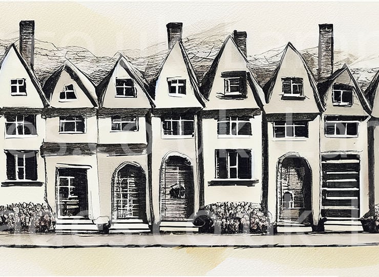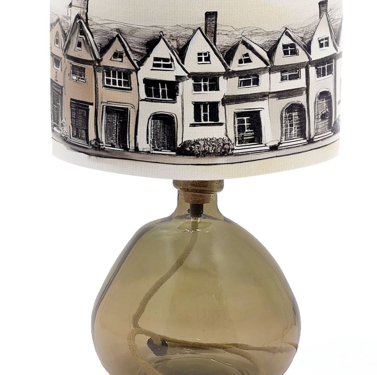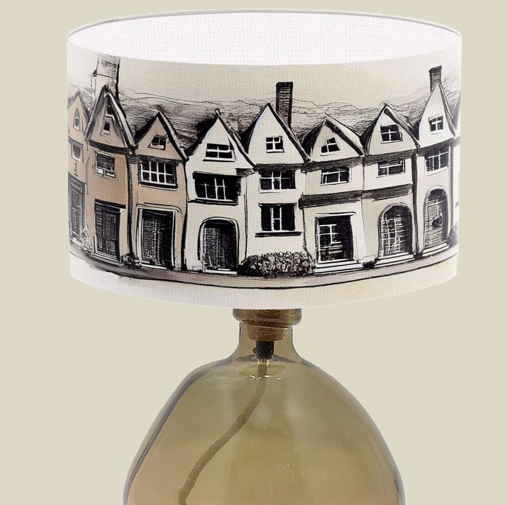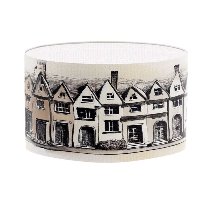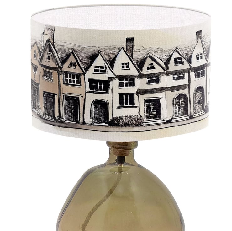 Lampshades don't have to plain and boring. Light up your room in style, color and design. This lampshade is printed with an illustration of Town Houses.