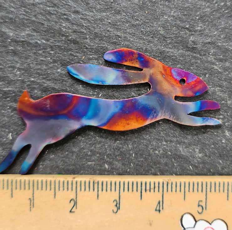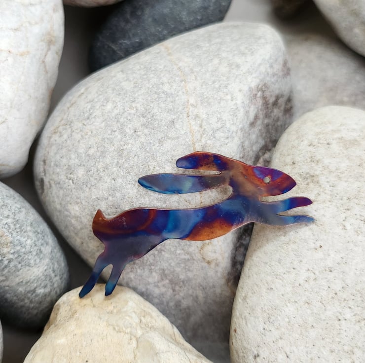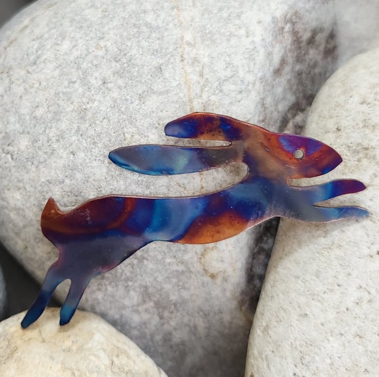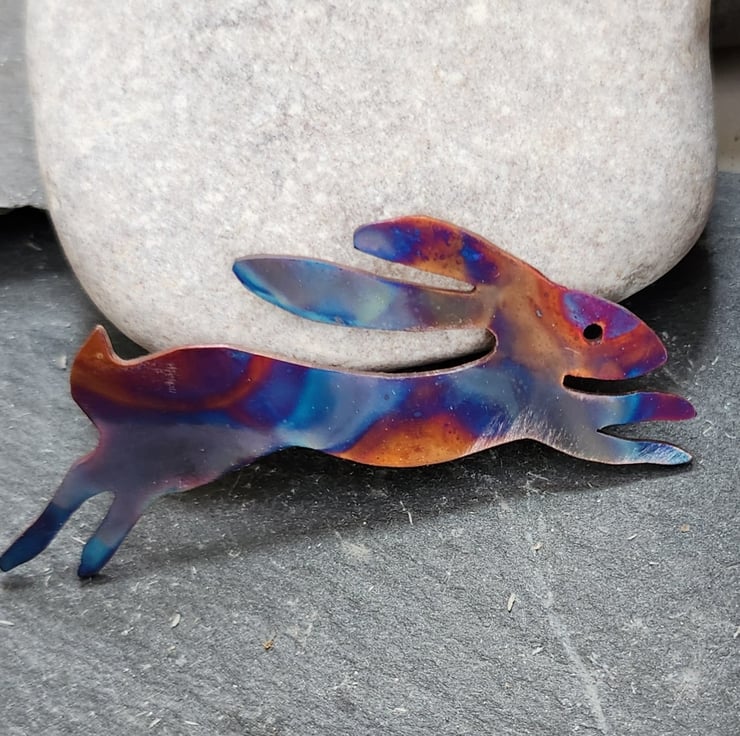 Hare brooch cut from copper sheet and flame painted. Just under 6cms long.This is a technique that produces one-of-a-kind pieces and as you can see, the pattern is unlikely to be replicated. It is done with a micro torch producing different hues of blues, purples, pinks, yellows, browns with each firing.