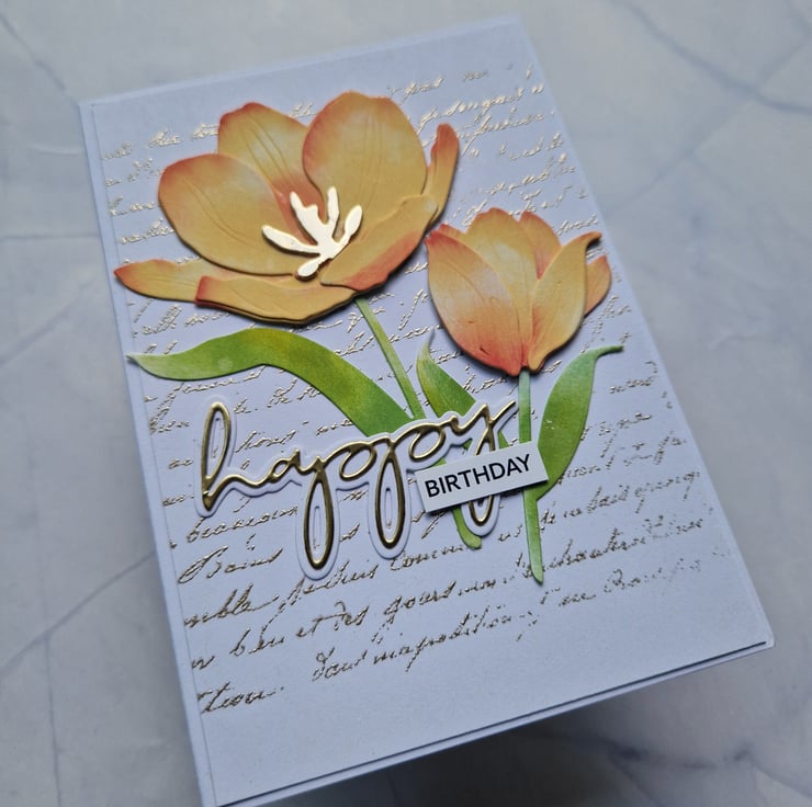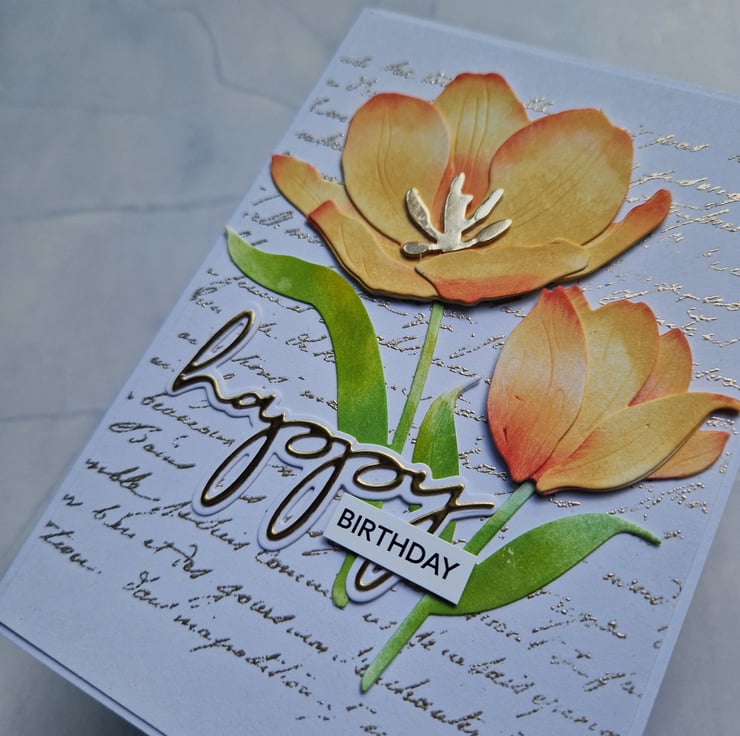 A beautiful textured handmade card featuring two stunning orange tulips against a white background heat embossed with gold script text. Made from high quality materials, this card is sturdy and makes a great keepsake!