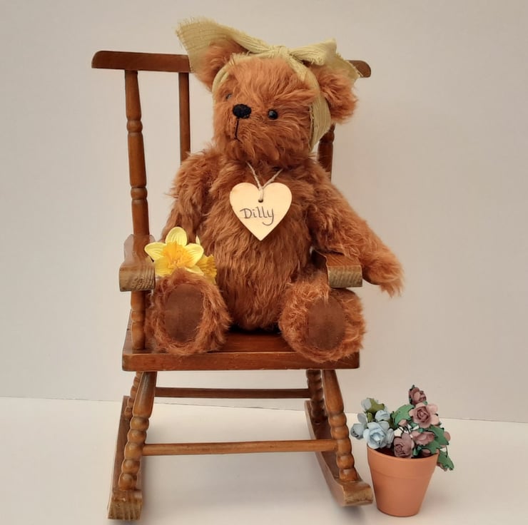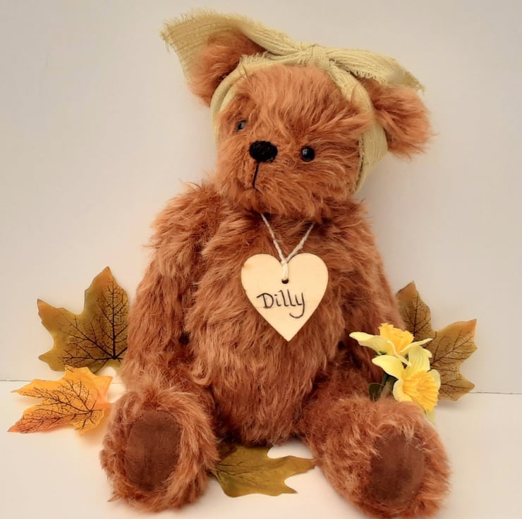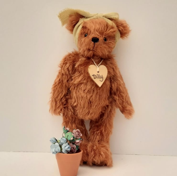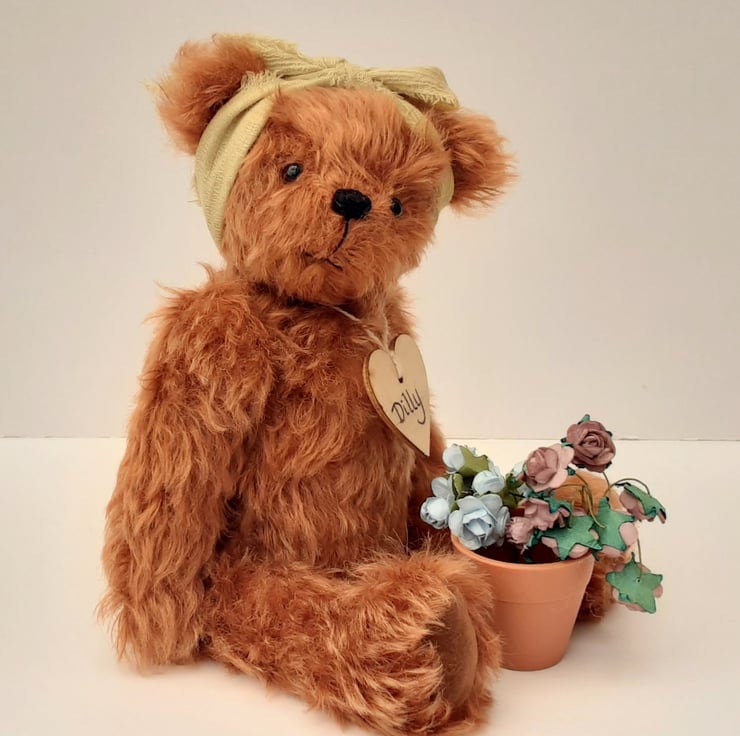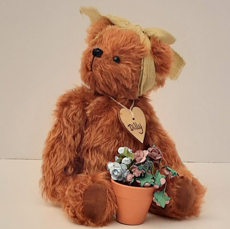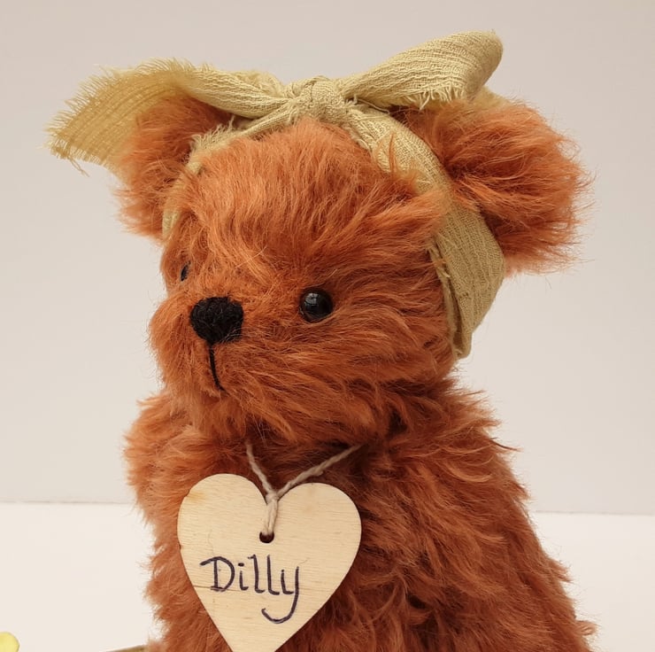 Dilly is a sweet natured bear, she usually gets her own way when playing with her twin brother Dally, she's the quieter of the two and would make a lovely keepsake gift or a unique addition to a bear collection. Dilly likes to play but would be happy sat in a corner, perhaps surrounded by flowers and watching the world go by.