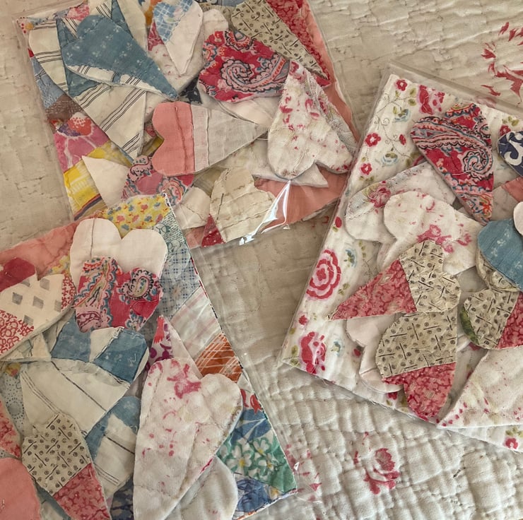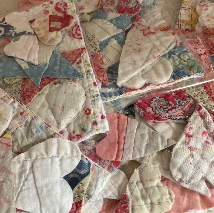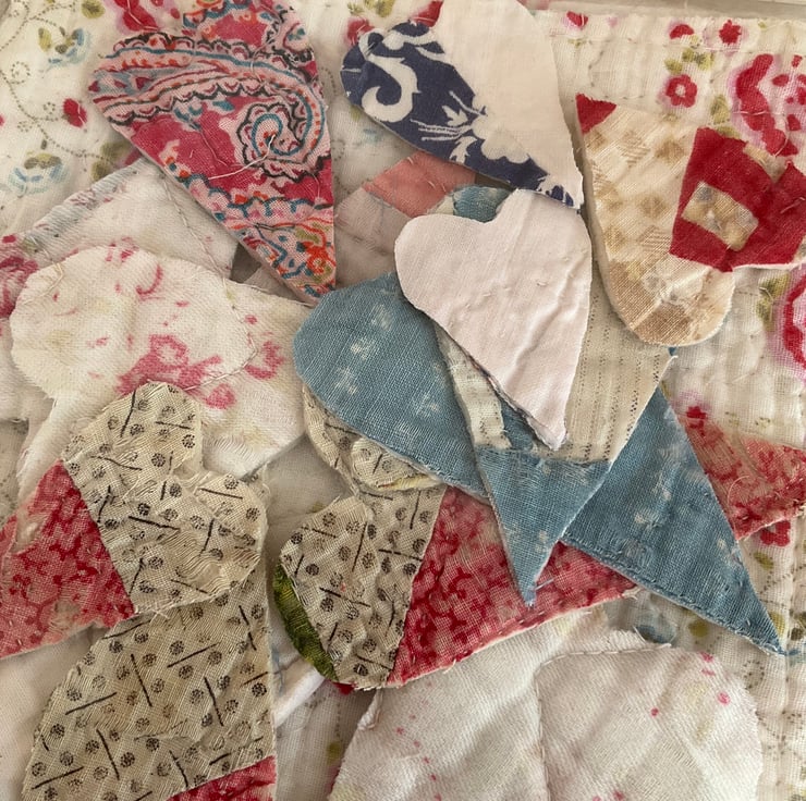 A collection of quilt hearts, hand cut in a variety of shapes and sizes. All created from vintage quilt, and vintage patchwork quilt. There is also one piece of quilt included, 16cm square.