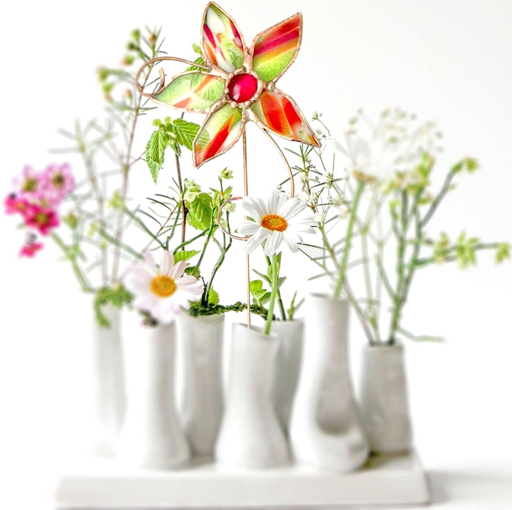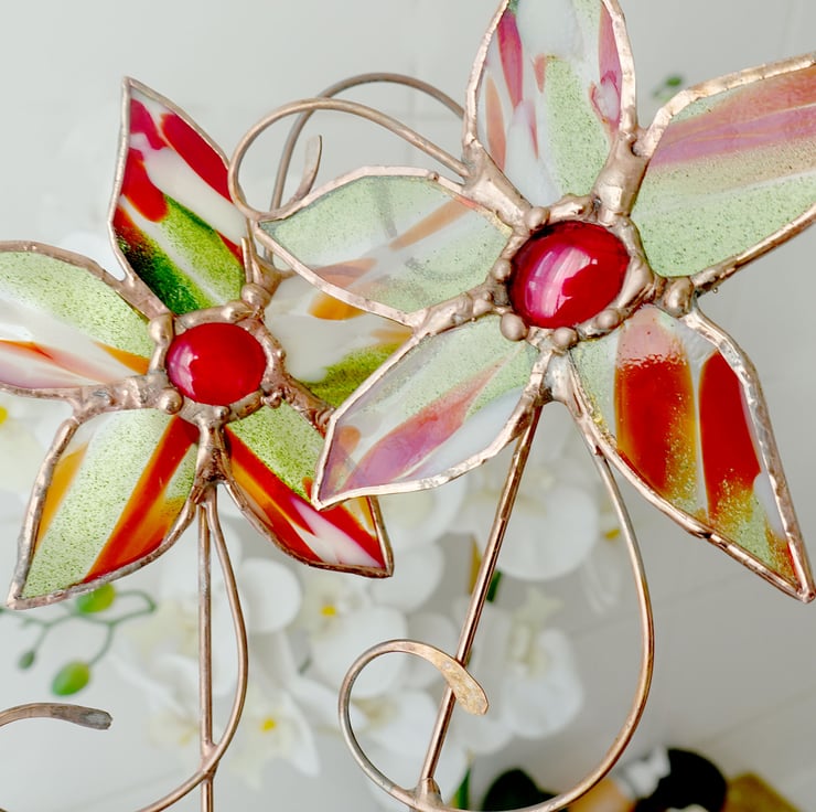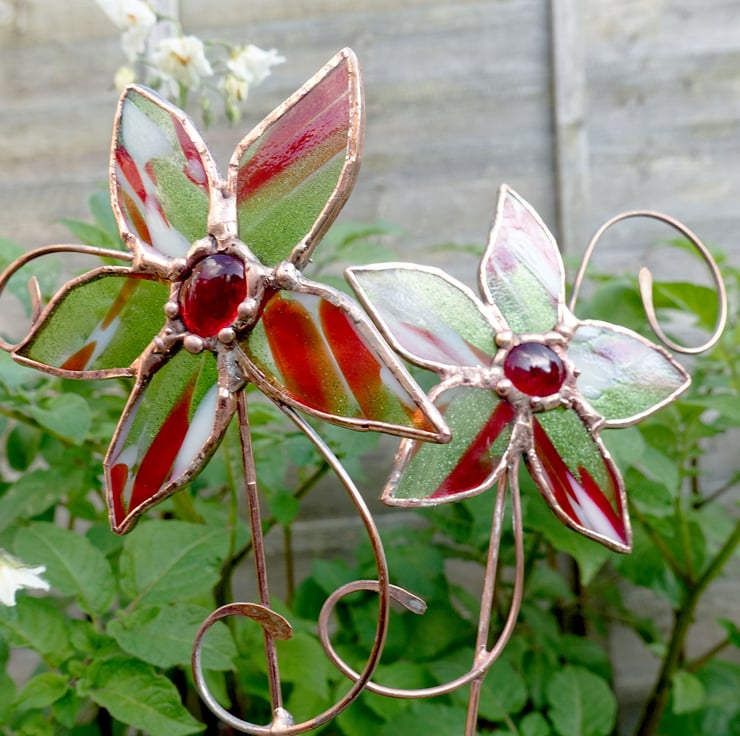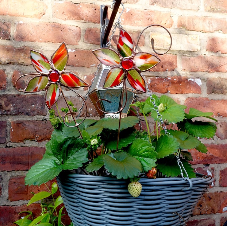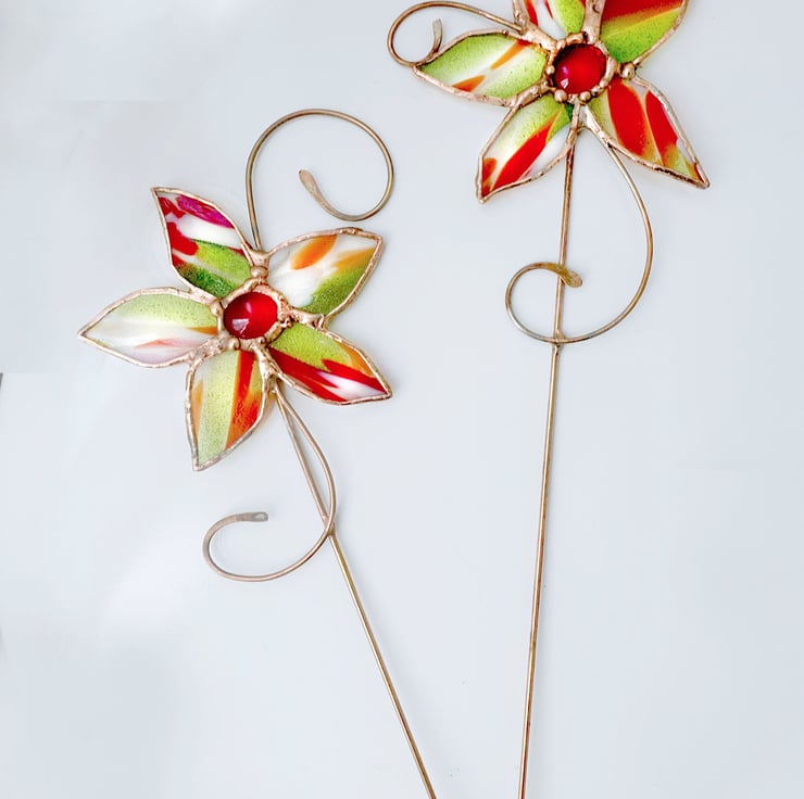 Lovely plant pot stake made from a pure copper rod and hand beaten detail, and a beautiful kind of stained glass called Spirit Fiesta which features stunning sparkly green aventurine, red and ivory streaks over a Crystal Clear base. The centre of the flower is a scarlet glass jewel.