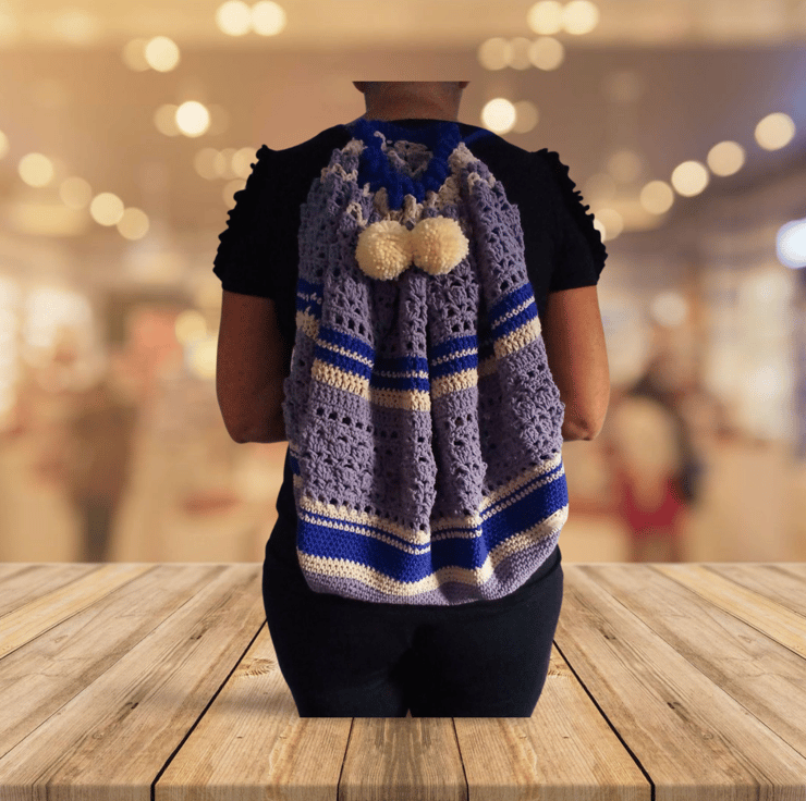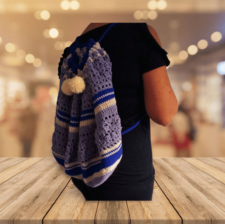 Crocheted drawstring backpack in purple and cream with pompom adornment. Ideal for festivals or light shopping.