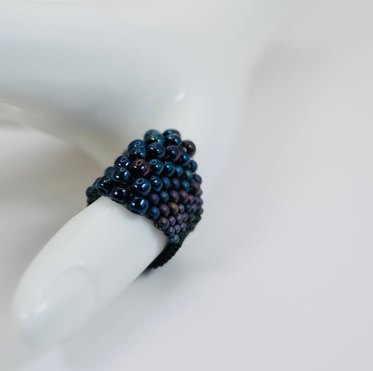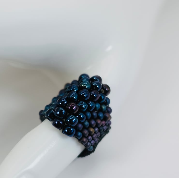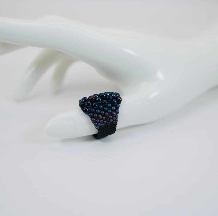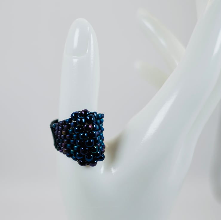 All rings are hand-stitched with Fireline - a thread similar to fishing line - giving your ring a little stretch, but a lot of strength. Made of high-quality Japanese Delica and Japanese Toho beads in bright, sparkling blues and shiny gold, this beautiful ring will brighten hands and jewellery boxes for years to come.