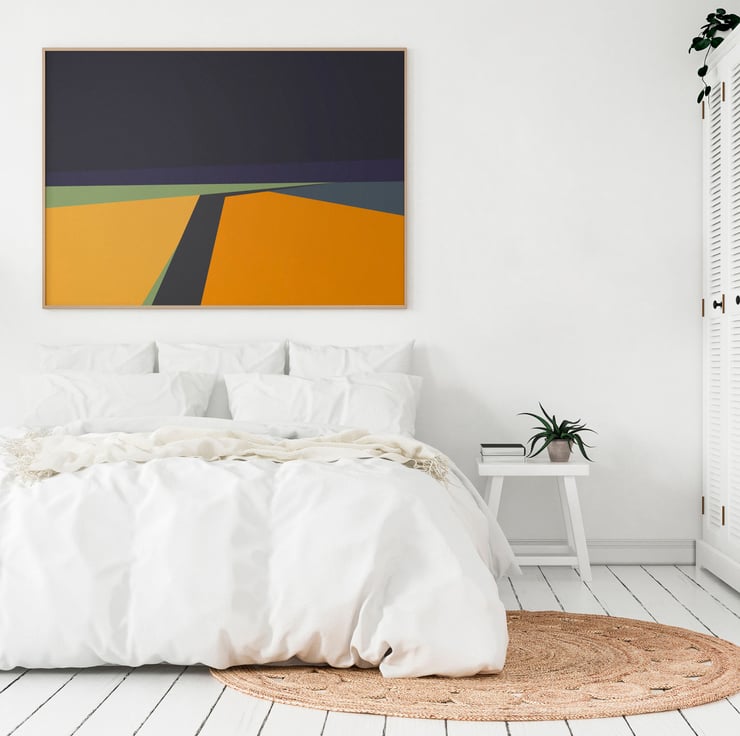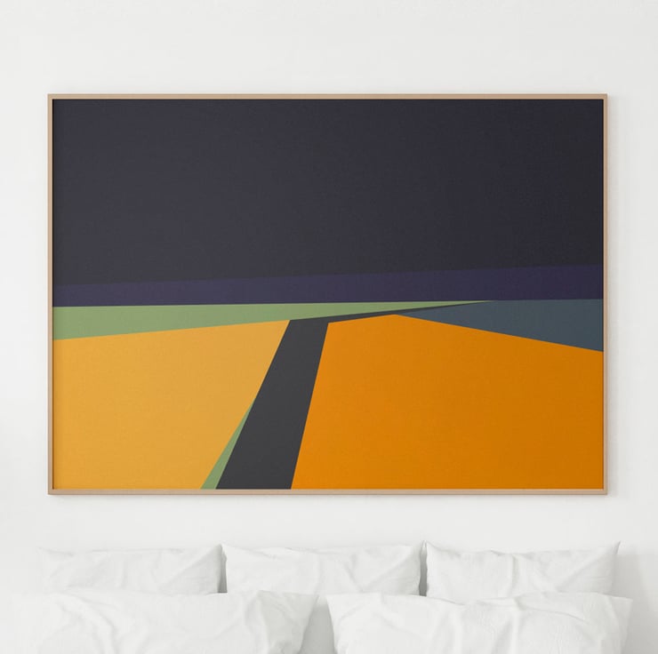 This painting showcases a contemporary geometric design featuring a journey through fields. The design showcases the beauty of the fields in abstract geometric shapes, creating a visually stunning. The bold colours and clean lines make this painting a perfect addition to any contemporary living space.