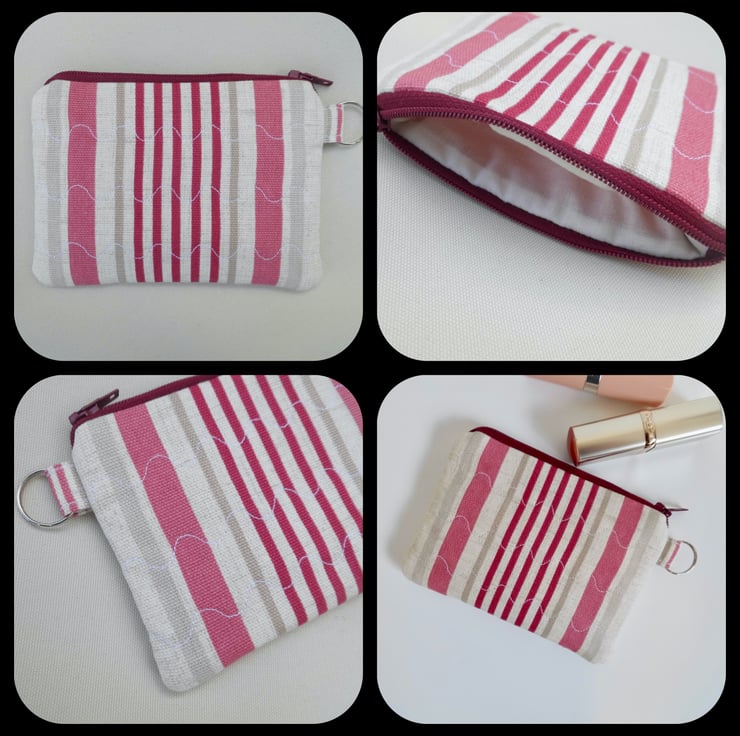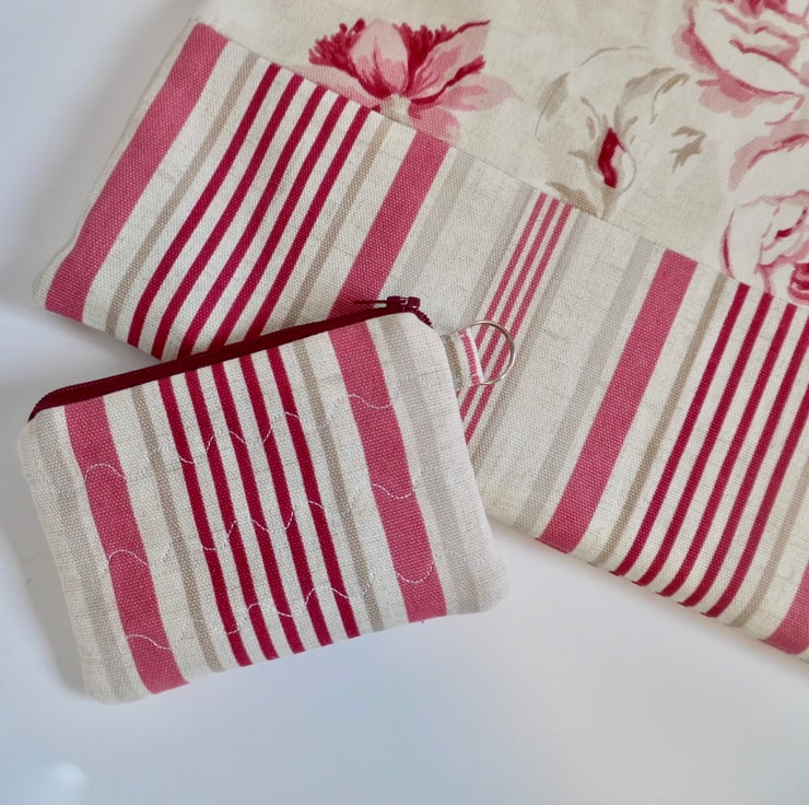 The purse has the same stylish stripes as the bag. I backed the fabric with felt for extra body and three lines of wave stitching either side give it a lightly quilted effect. It is lined with cream poly/cotton, has a dark red zip across the top and a key ring loop at the side. It measures 13cm x 9cm and could hold coins, cards, or other small items.
