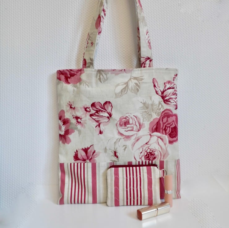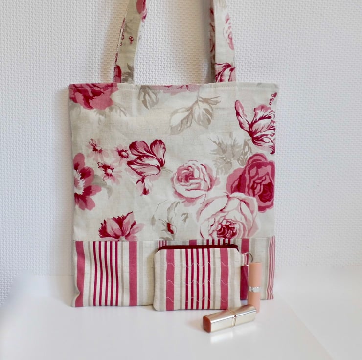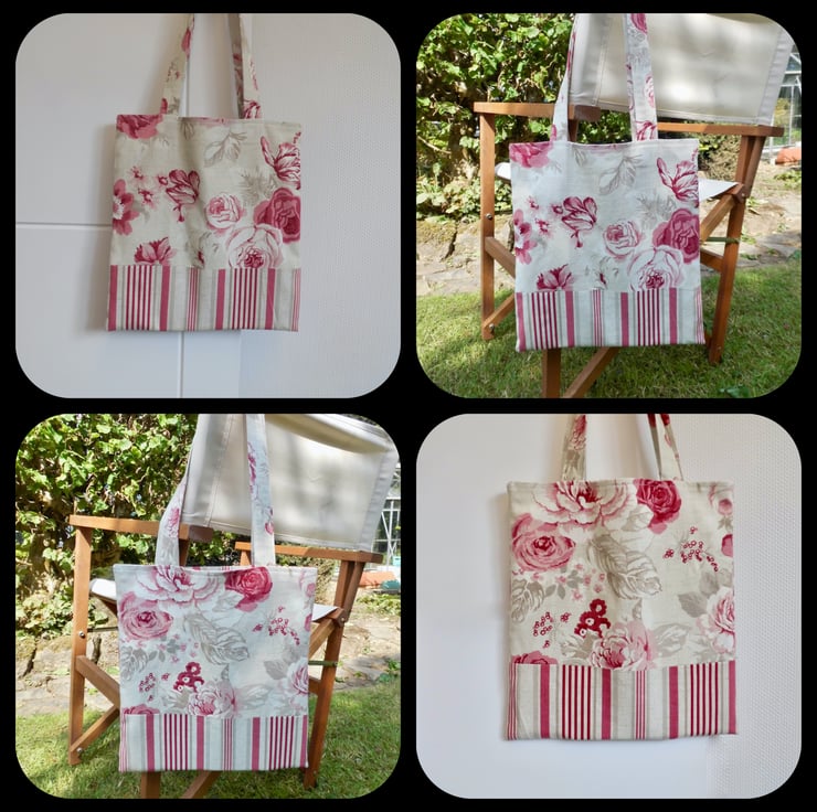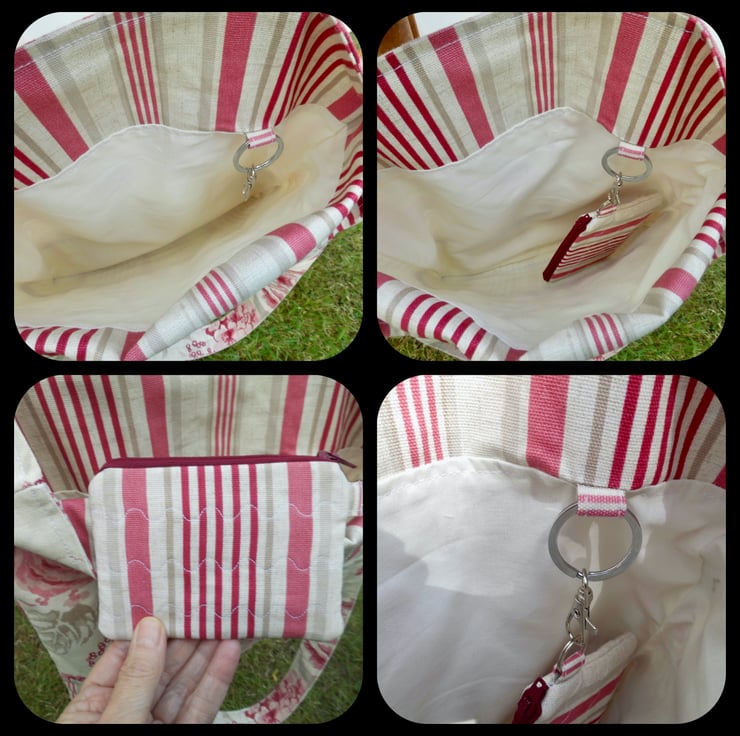 For the bag I used a furnishing weight cotton with a bold floral pattern in shades of pink and beige. Pretty yet durable, this is complemented by a striped base in the same raspberry colour way. Faced inside at the top with the striped fabric for a professional finish and lined with plain cream poly/cotton. The long handles measure about 55cm for easy carrying over the shoulder and have been top stitched along the edges and down the middle with ivory thread. Inside, I have inserted a keyring loop complete with lobster clasp so that the purse can be clipped inside safely. It measures approx 32cm x 34cm.
