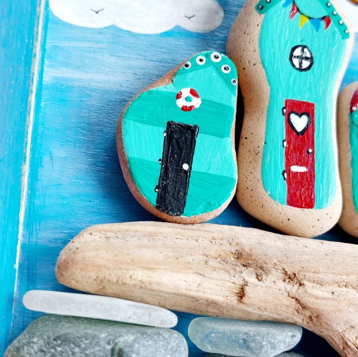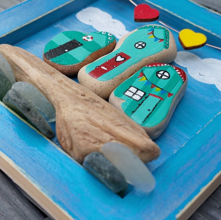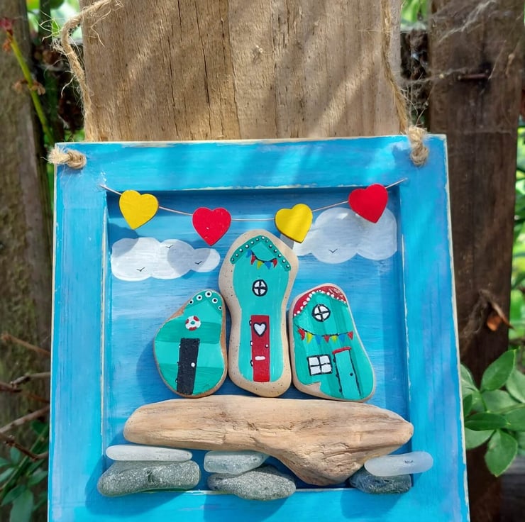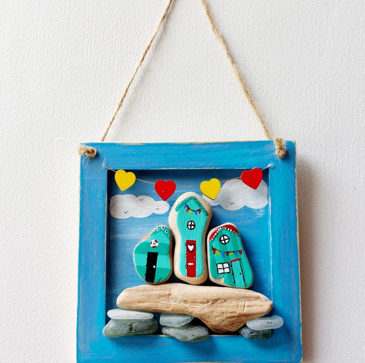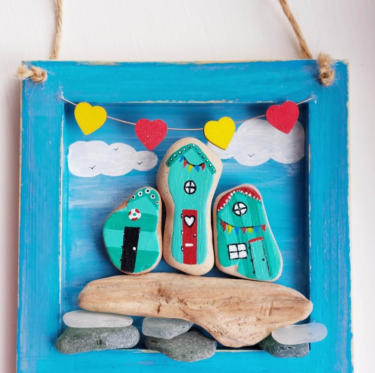 This adorable and eye-catching piece of original artwork shows a trio of quirky, bright hand painted beach huts atop a piece of driftwood. The beach huts are crafted from smooth pieces of pottery found on my beachy travels and are perched above sea glass, also beachcombed. This hand painted piece has been created within a box frame, hand painted in a bright blue with yellow and red heart-shaped bunting strung across the top. The whole piece has been strung with natural jute so you can hang it on your wall.