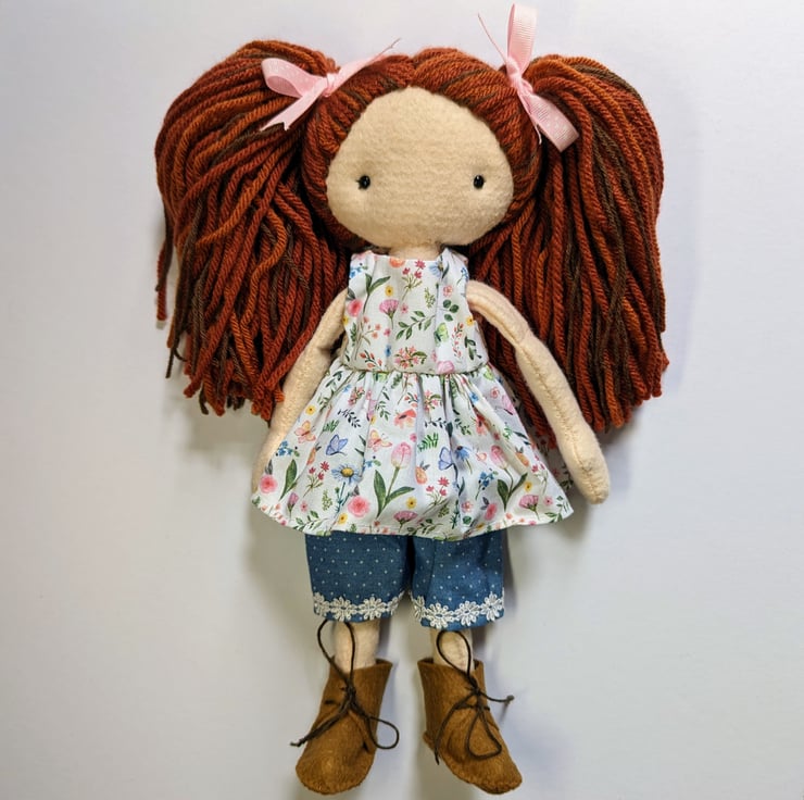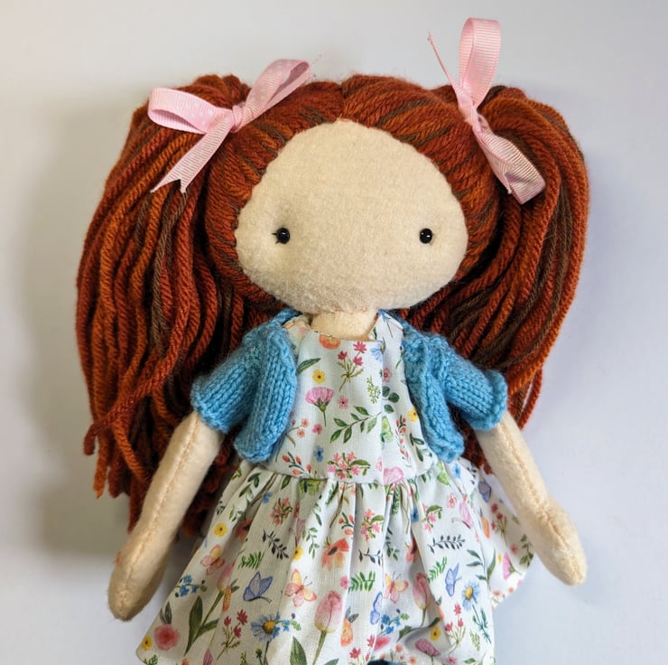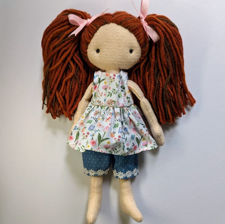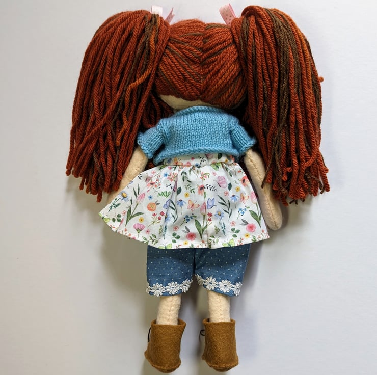 I was inspired to make Flora by the beautiful floral fabric I used for her dress! I have had it for ages and was waiting for the perfect project to use it. The sun has started to shine here in North Wales and it is starting to feel like summer is trying to arrive. I have got my flip flops out! I also wanted to try a different method of doing this doll's hair, so that led to the creation of her full pigtails! I am very pleased with how Flora turned out, I hope you love her too xx