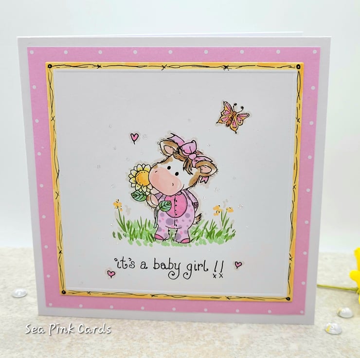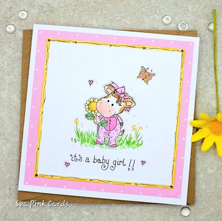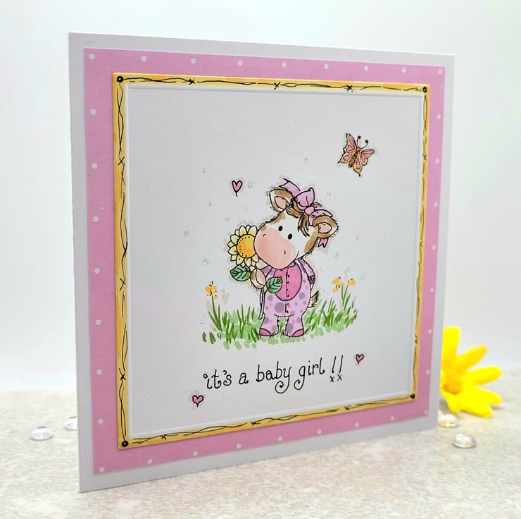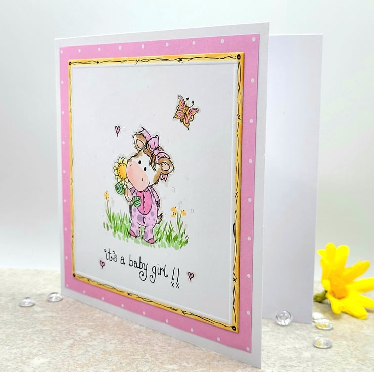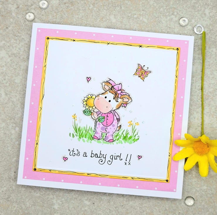 A new baby girl card, with an adorable little baby calf. A layered design with pink design paper and an embossed yellow edge with hand-drawn details. The little calf is stamped by hand. I then added additional hand-drawn elements, a onesie and hair bow for her to wear and background details, hearts flowers and grass, with fineliner pen. Coloured by hand with artist ProBrush Markers for a professional finish. There is a hand-written sentiment in fine black ink, it's a baby girl. Individually designed and handmade in my craft room, to create a one-of-a-kind greeting card.
