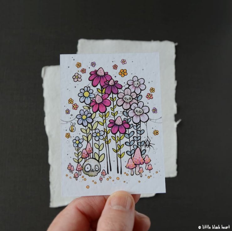 this is an original artwork in artists pens, ink, pencils, and paints, on textured white 300gsm cardstock. drawn with a tiny 0.05 nibbed pen, carefully painted with just the very tip of a tiny paintbrush, and coloured with art pens and coloured pencils.