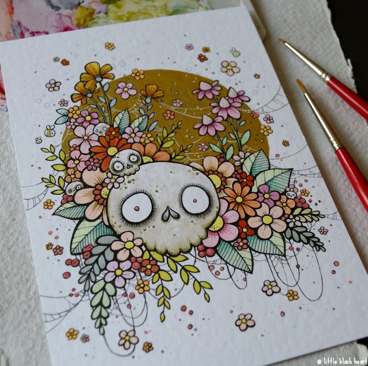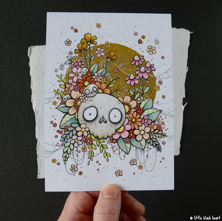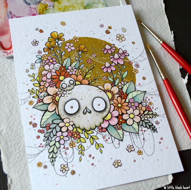 this artwork is an original illustration in artists pens and watercolours, on a lovely textured cardstock (300gsm). hand drawn in fine detail with a tiny 0.05 nib, and carefully coloured with art pens, paint, coloured pencils, and just the tip of a tiny paintbrush.