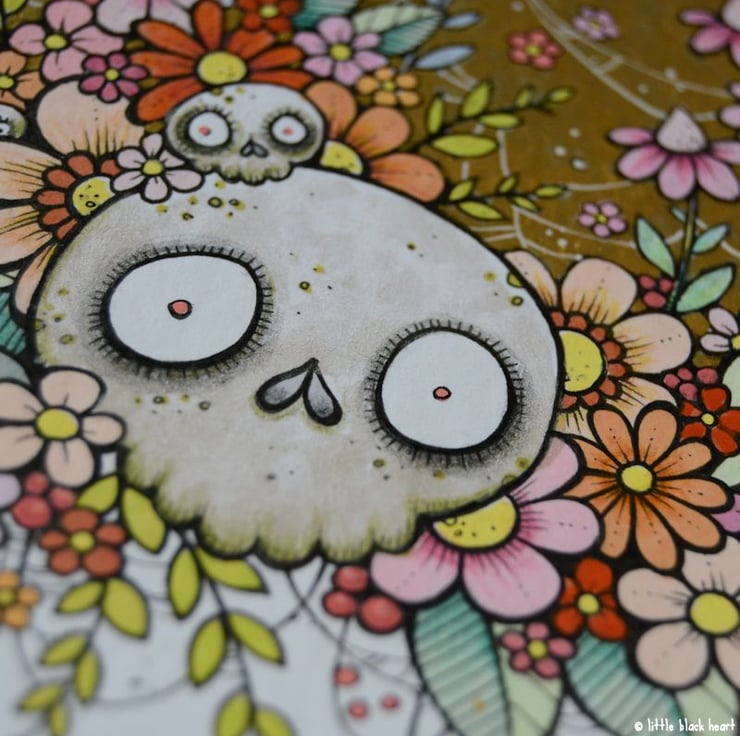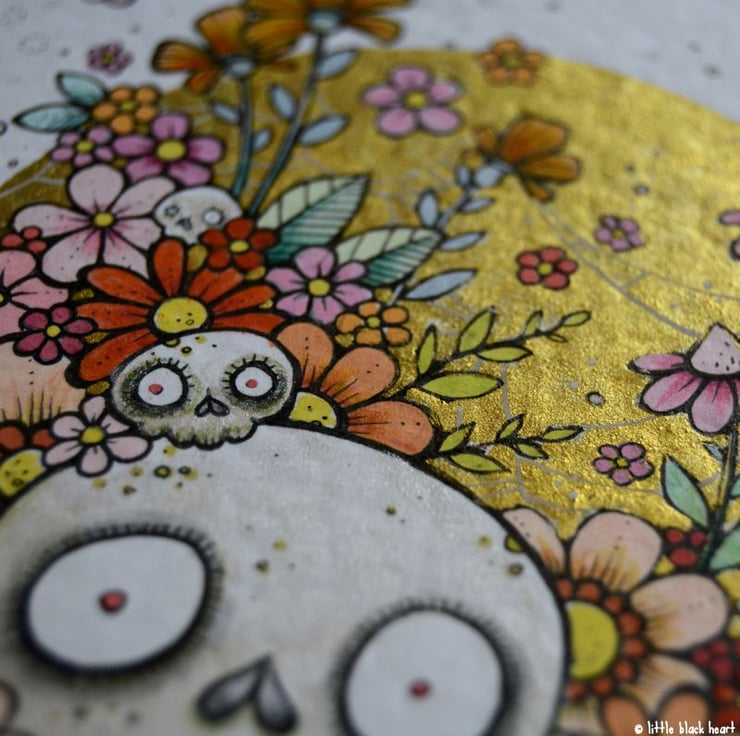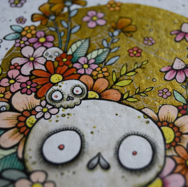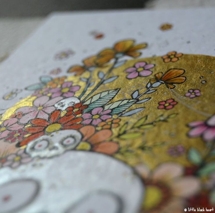 a sweet summer skull in full bloom, surrounded by blossom and bees, enjoying all the colours of the season. he sits on a background painted with a warm metallic gold.
