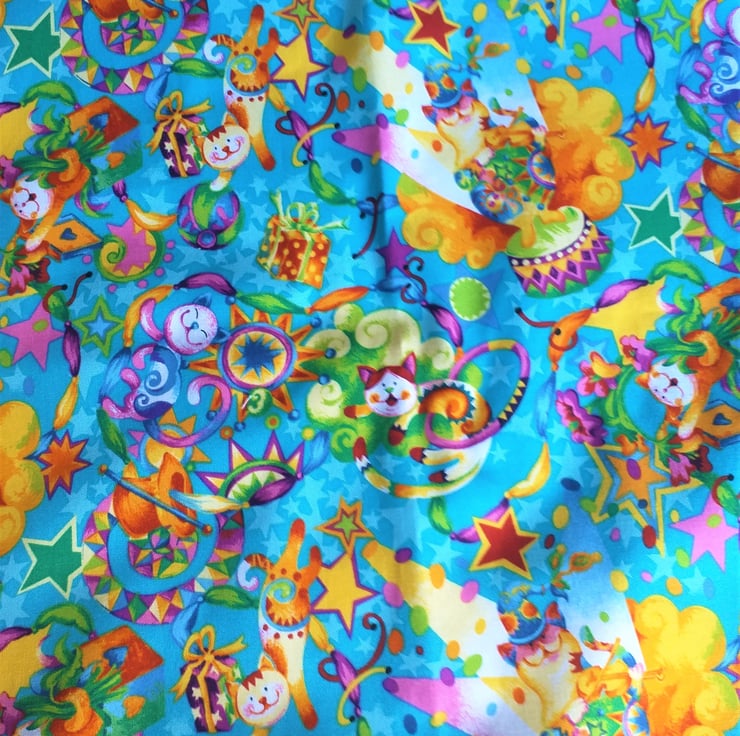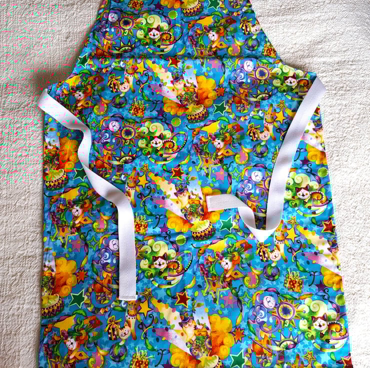 This lovely turquoise apron is covered in multicoloured cats performing magic. It measures 27" (69cm.) from neck to hem and 19" (48cm.) at the widest point and fits a child of about ten to a small adult. The straps are white acrylic. The fabric is good quality cotton and is machine washable.