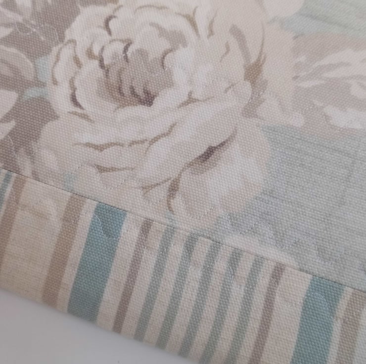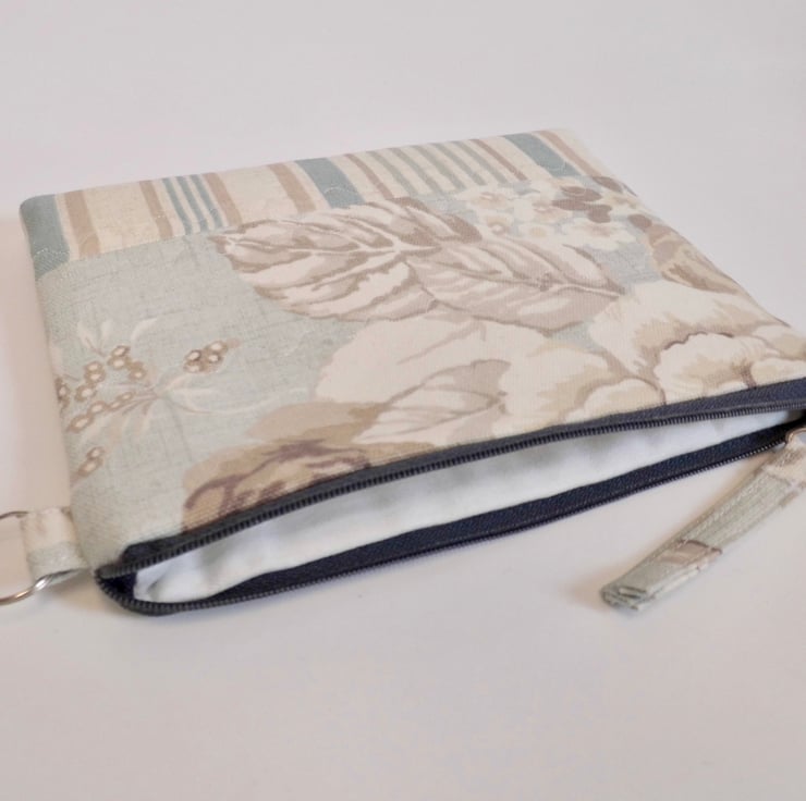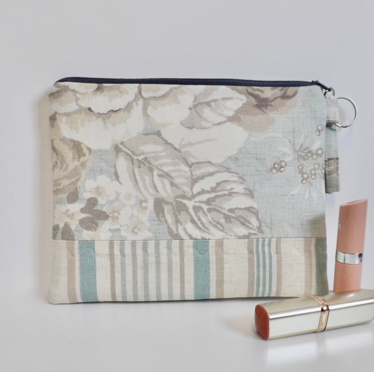 This zipped cosmetic purse is made with furnishing weight cotton fabric. The upper part is a large floral pattern in soft, muted tones of blues, greys and beige while the lower part is a complementary striped design. I backed the fabric with fusible fleece and then machine stitched across each side with three rows of wave stitch to achieve a lightly quilted effect. It is lined with plain white cotton.