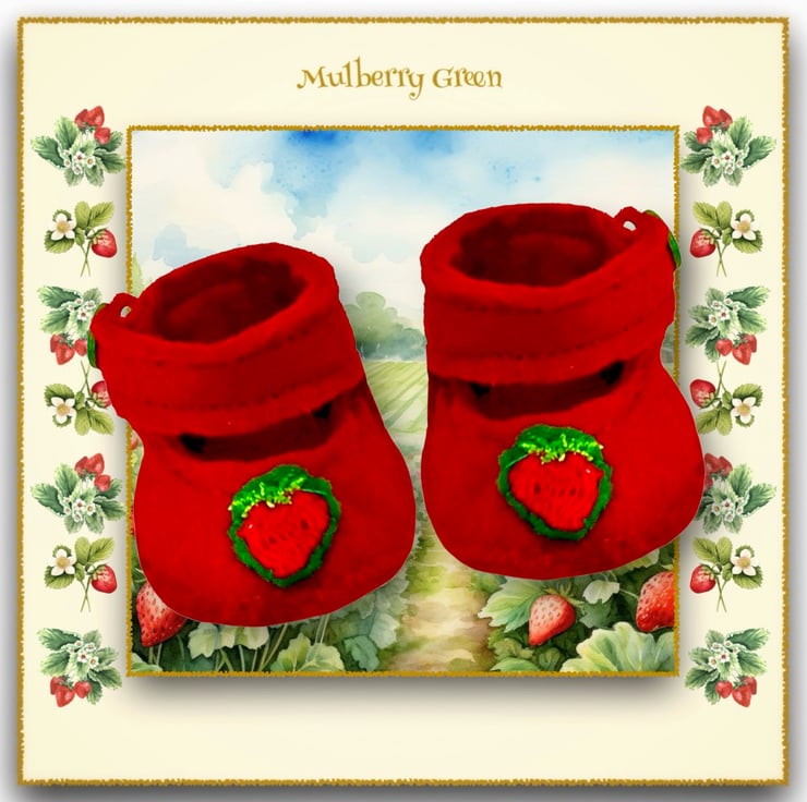 A cute little pair of red shoes, embroidered with little strawberries, to fit the Mulberry Green characters. The shoes look lovely with the little dresses.