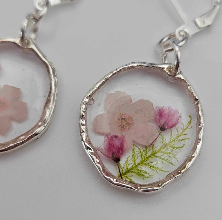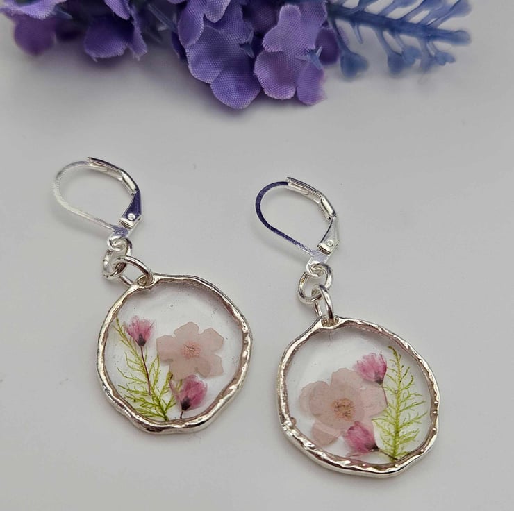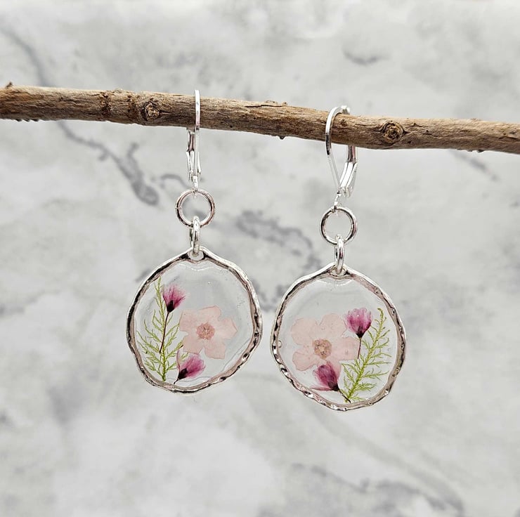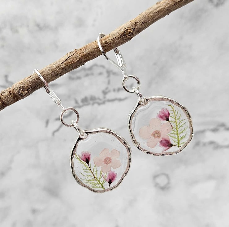 flower terrarium earrings, resin flower earrings, silver earrings, cottagecore,
