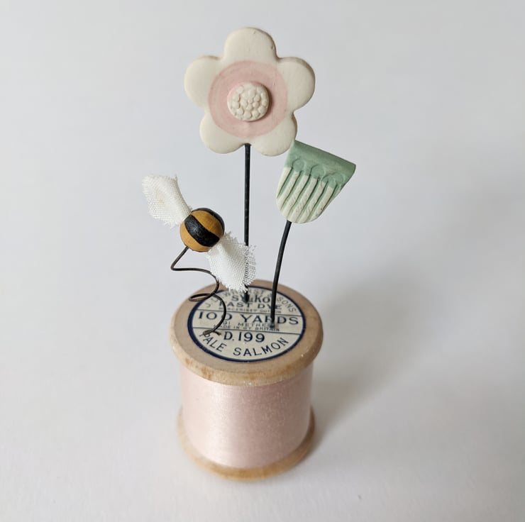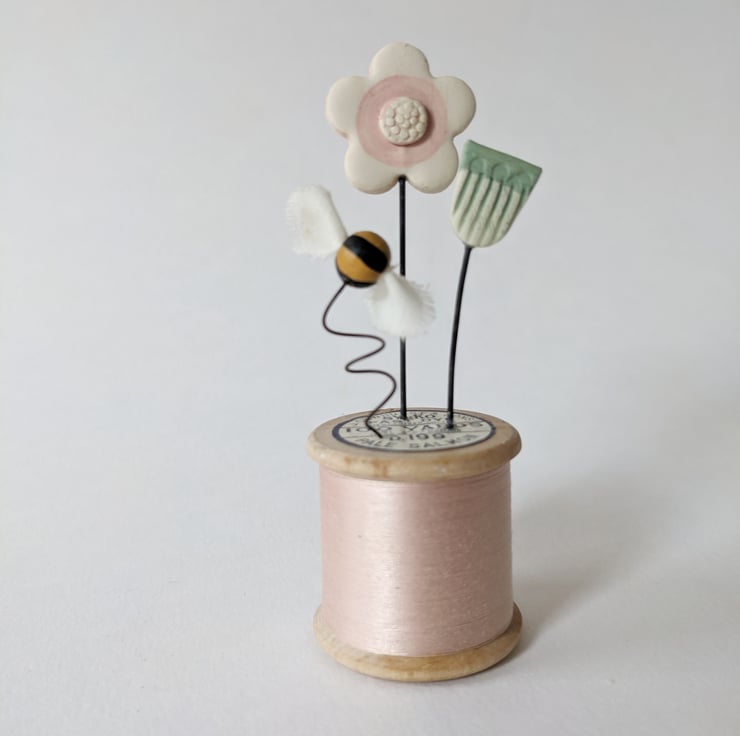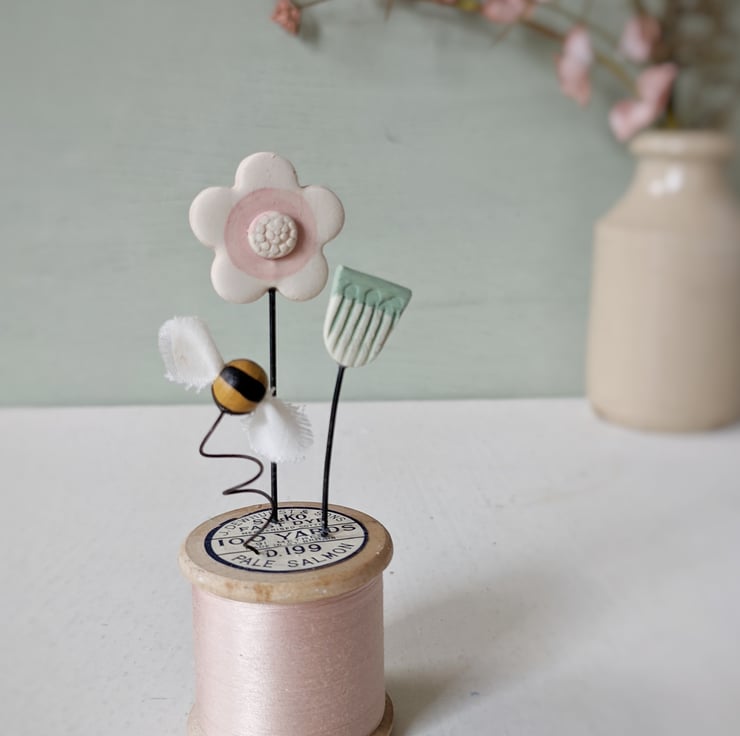 A handmade little wooden bee buzzes by pretty clay flowers standing in a vintage wooden bobbin.