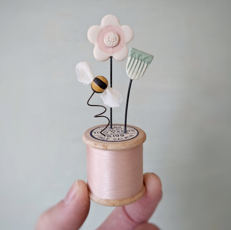 I love finding old bobbins on rummaging trips! The tiny bee bounces on top.