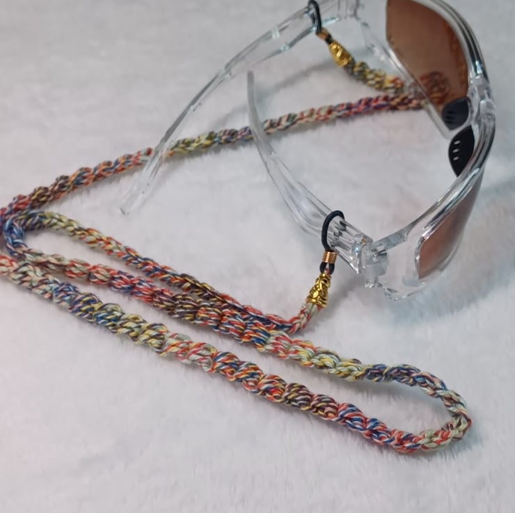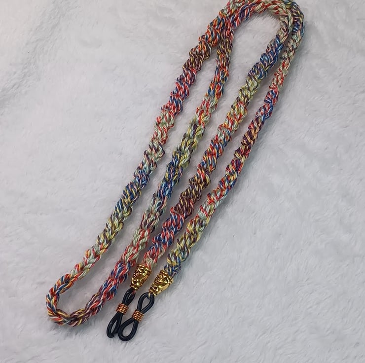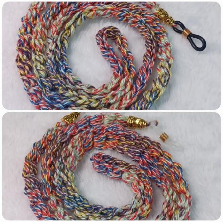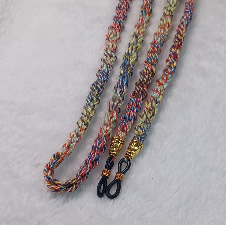 Crochet summer multicolours (blue, red, yellow) cotton chain for glasses with nice gold colour end bead and black or white (clear) loop