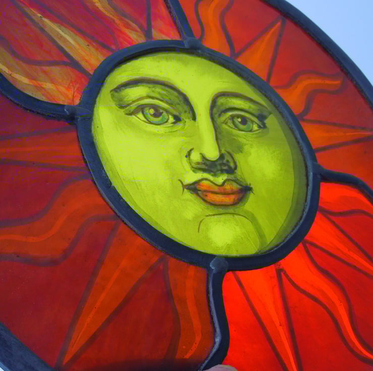 The sun's face is surrounded by delicate, swirling patterns of colored glass, reminiscent of clouds or wispy tendrils of sunlight. These shades of blue, pink, and orange blend harmoniously to create a sense of movement and energy, as if the sun is radiating its warmth and light.