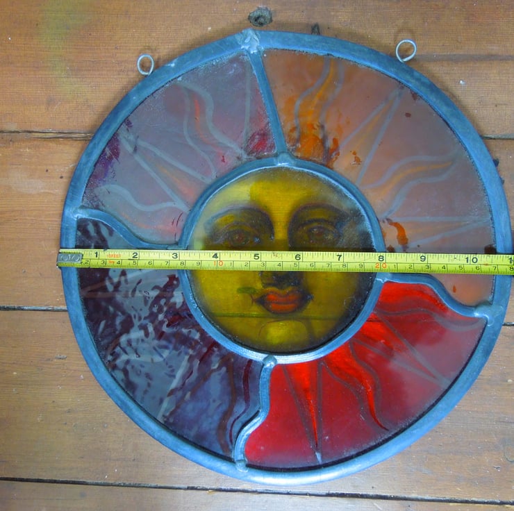 What a delightful and whimsical piece of art! The stained glass suncatcher depicts the sun with a playful smiley face, radiating warmth and joy. It's approximately 11 inches in diameter. Here's a vivid description of this charming piece: