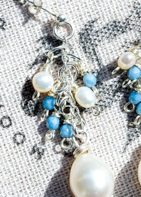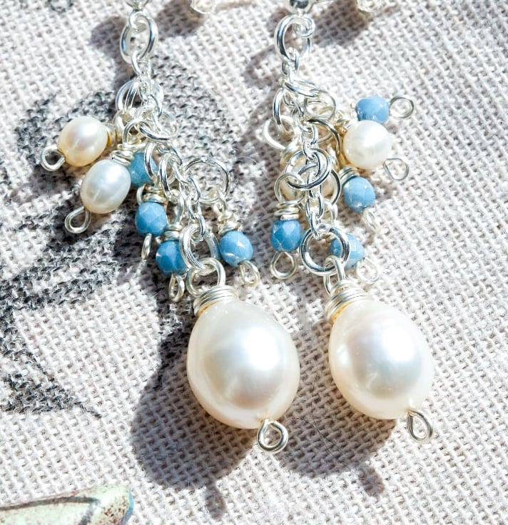 I've used sterling silver components, including solid silver ball-pin ear-wires with secure butterfly backs, recycled sterling silver wrapping wire for the beads, genuine freshwater pearls, and shimmering pale blue Czech glass accent beads.