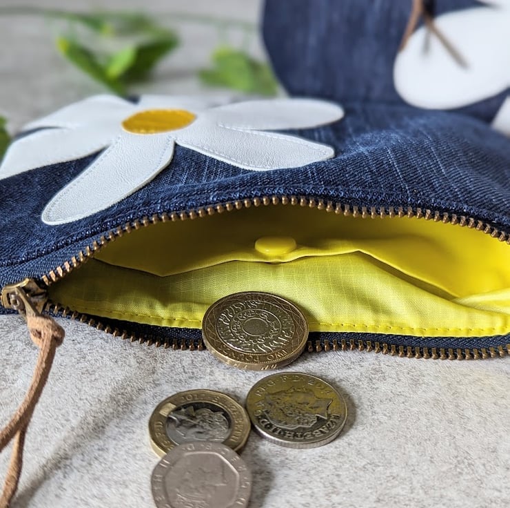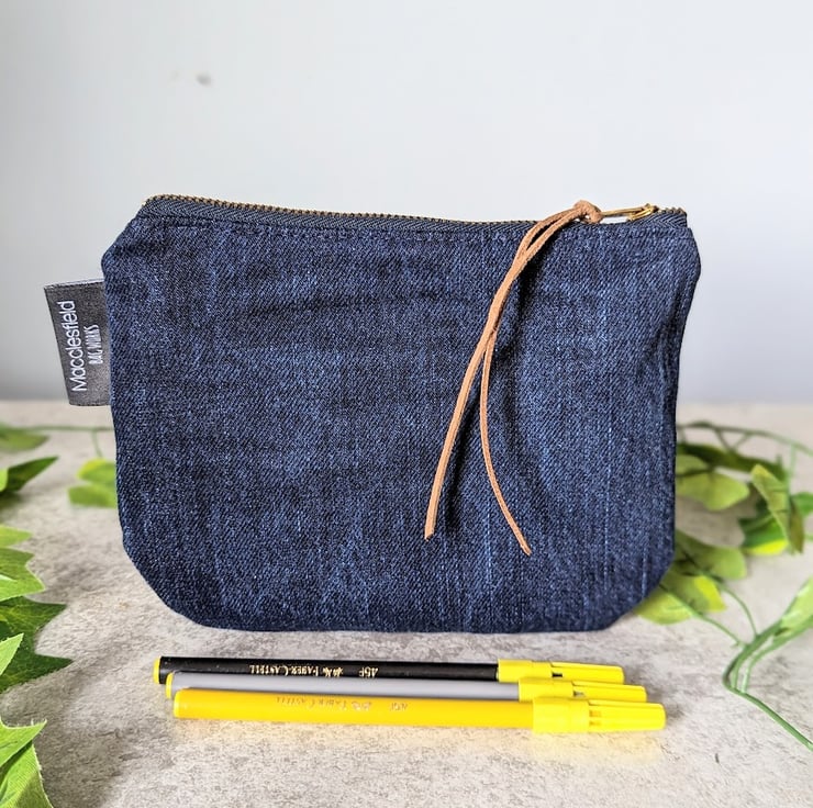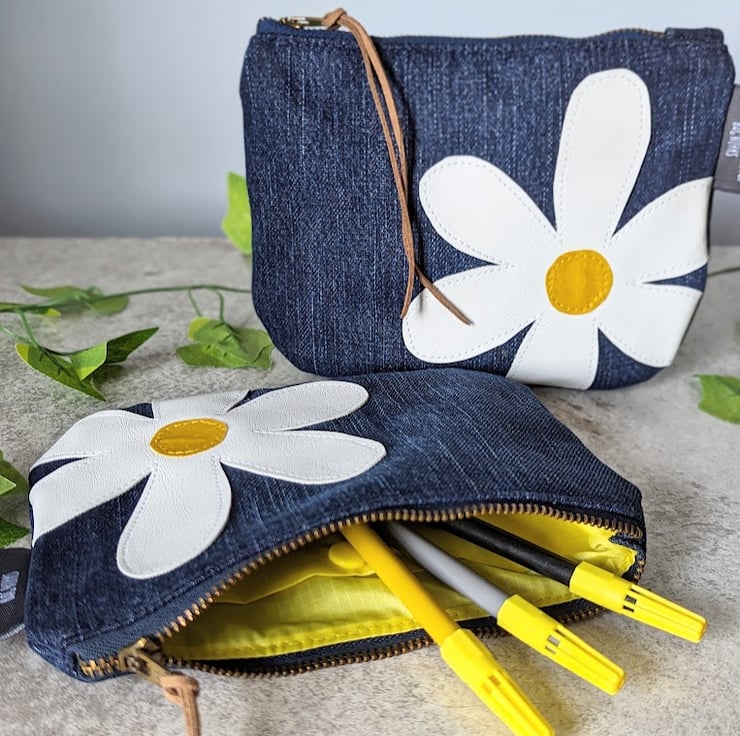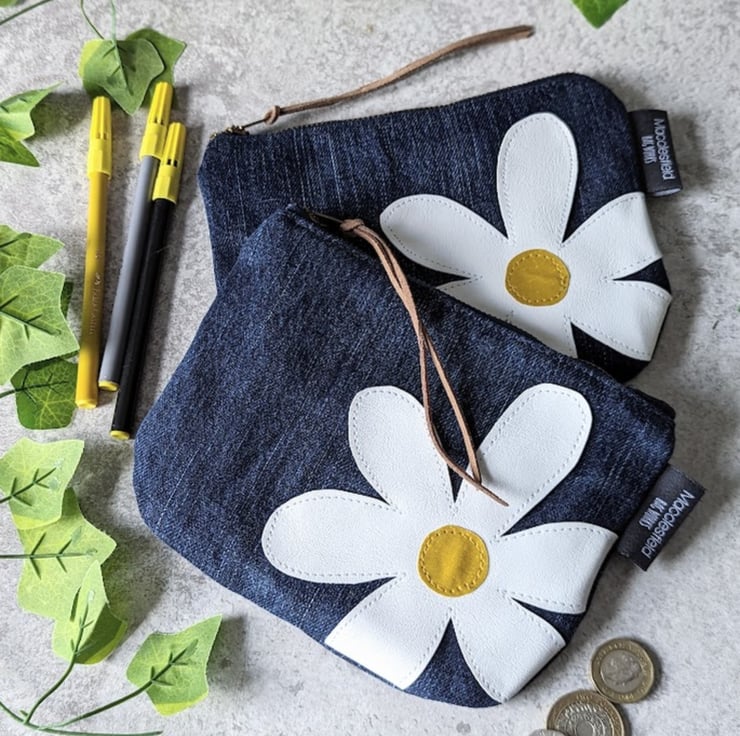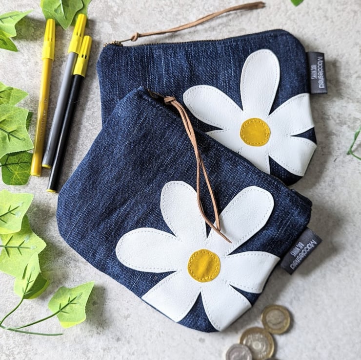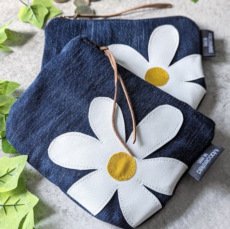 Full of quirky character....and daisies!! These recycled denim pouch purses have been handmade from pre-loved dark blue denim. Ideal for use as a make-up bag, pencil case or purse. Or great for all those little bits that end up in the bottom of your bag.