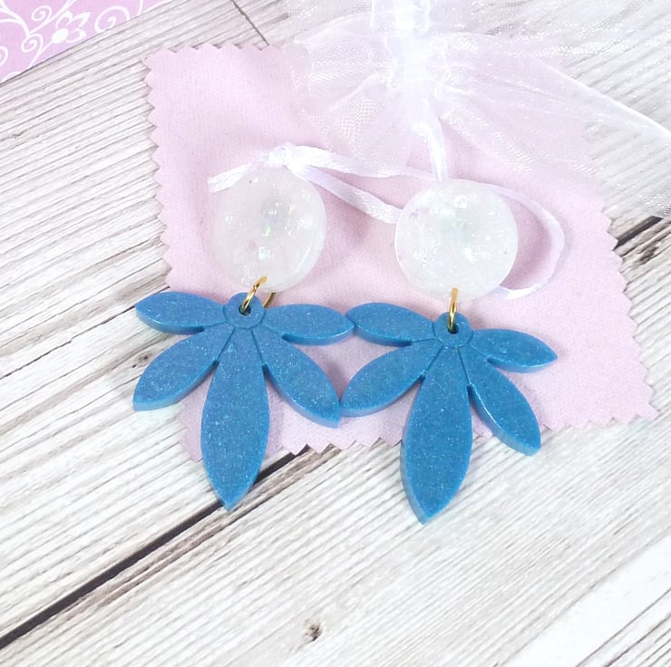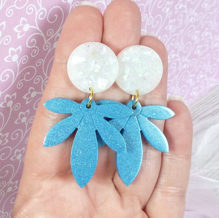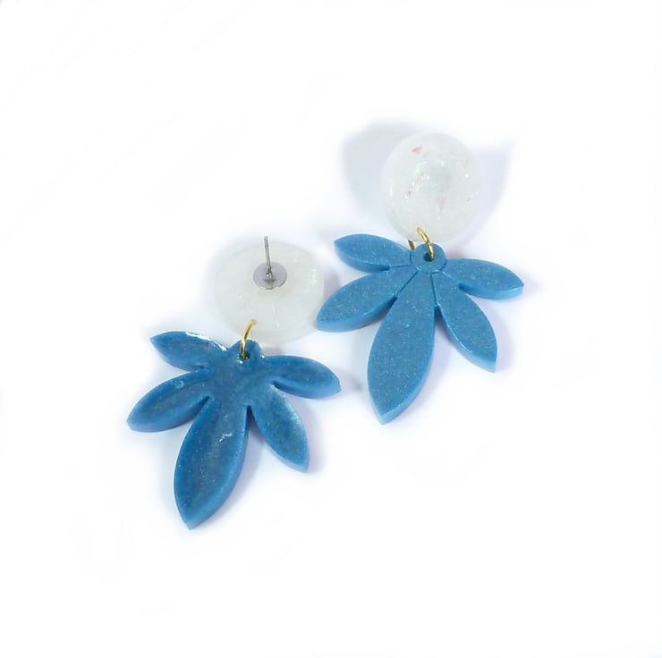Blue palm leaves are attached to white resin studs in these fun and funky resin earrings. Made from epoxy resin coloured with a metallic blue mica powder, and a white dye and iridescent flakes. Large and unusual statement earrings with stainless steel posts and butterfly backs.