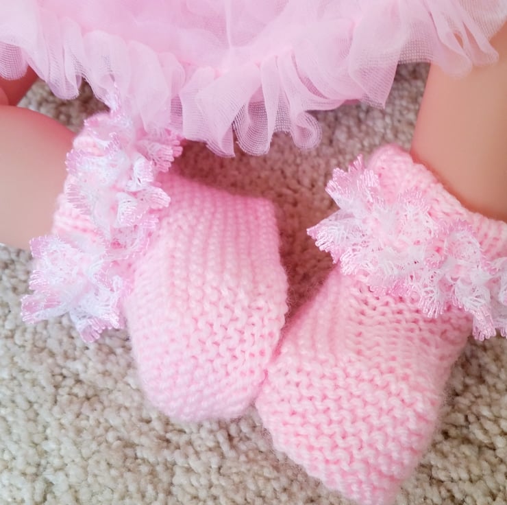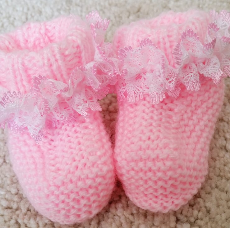 Hand knitted baby girl pink booties with ribbed cuffs and pink and white lace