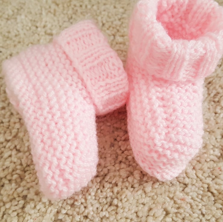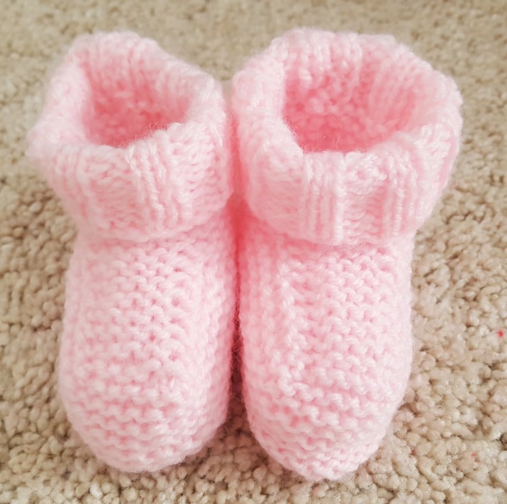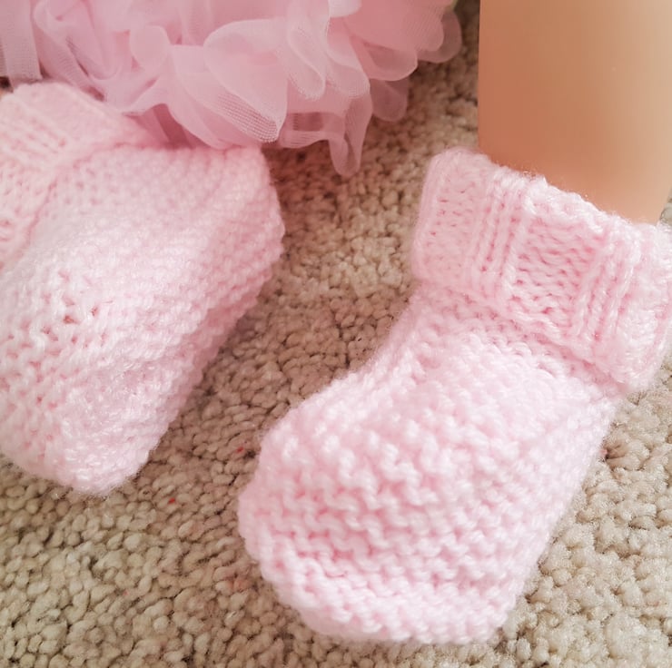 Hand knitted baby girl or reborn baby doll pink booties in 2 sizes with a ribbed folded over cuffs around ankles to keep tiny feet warm
