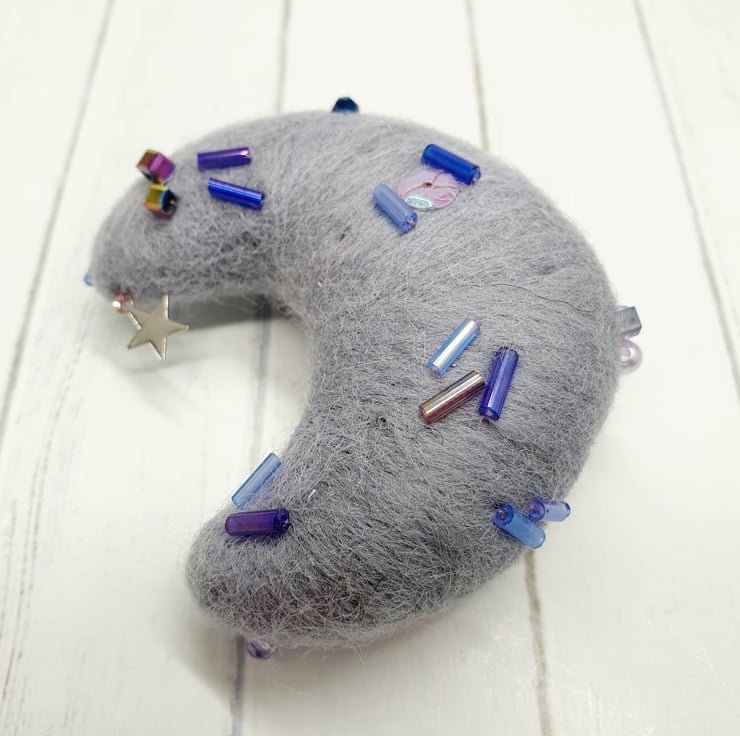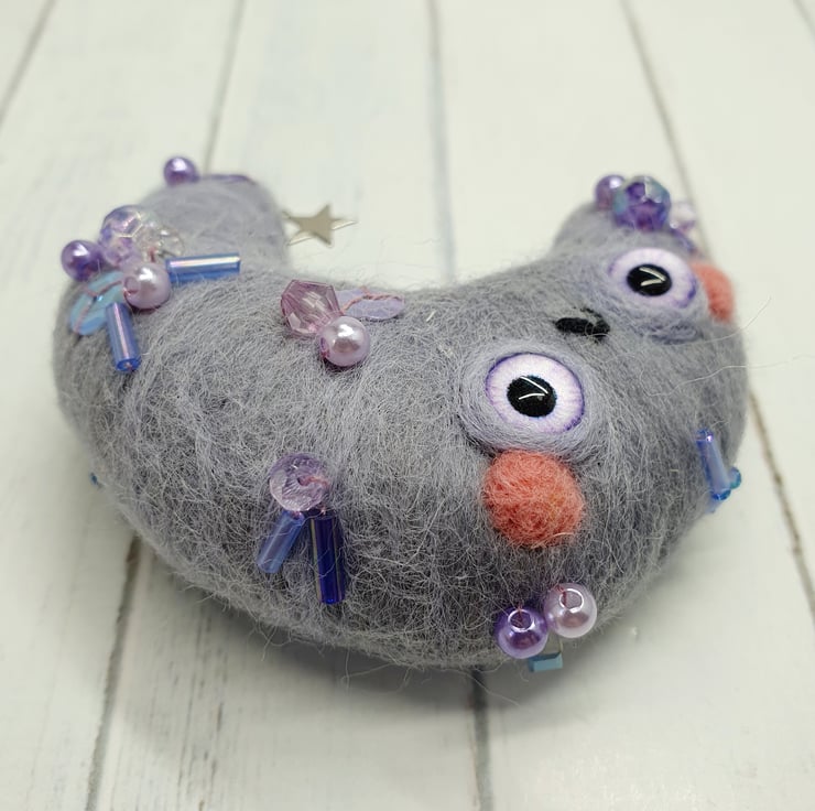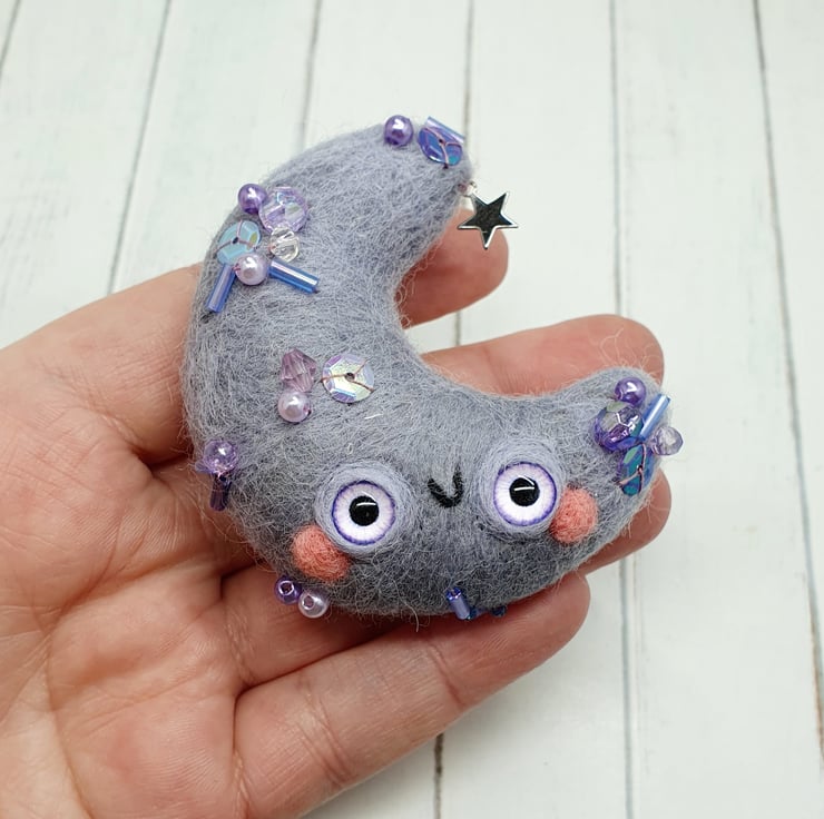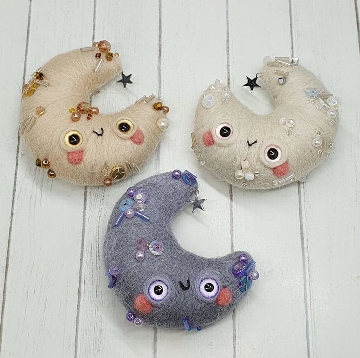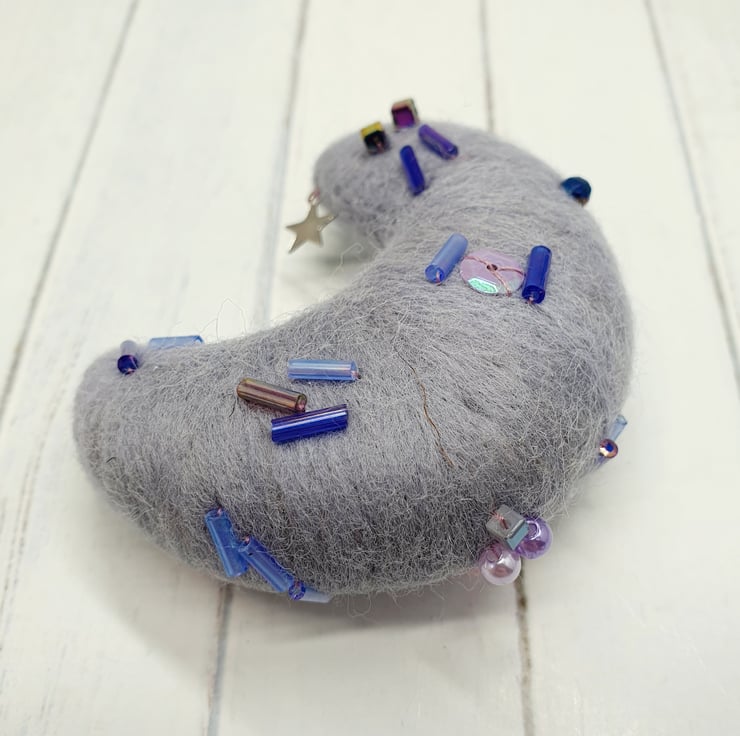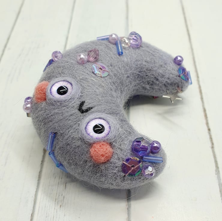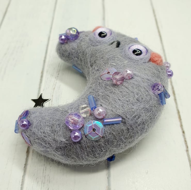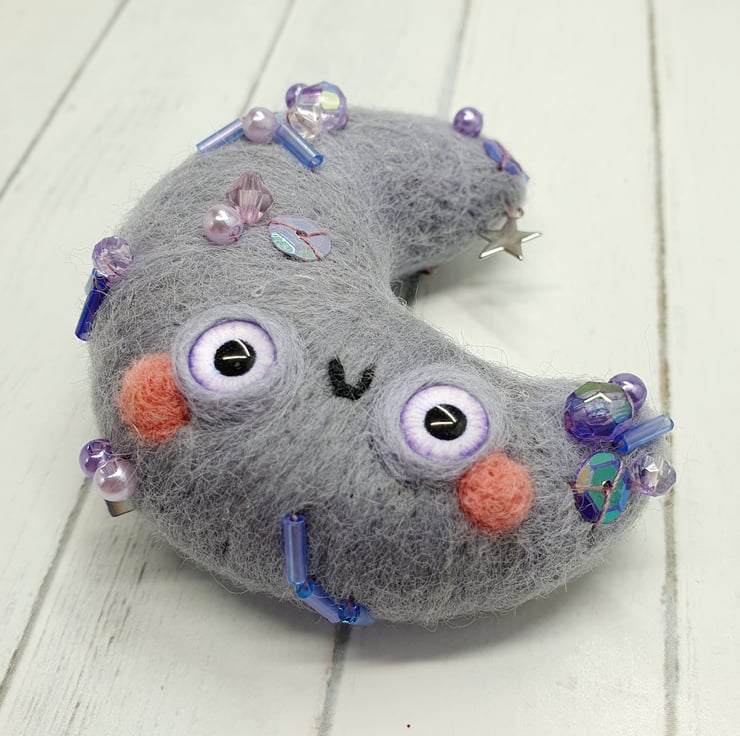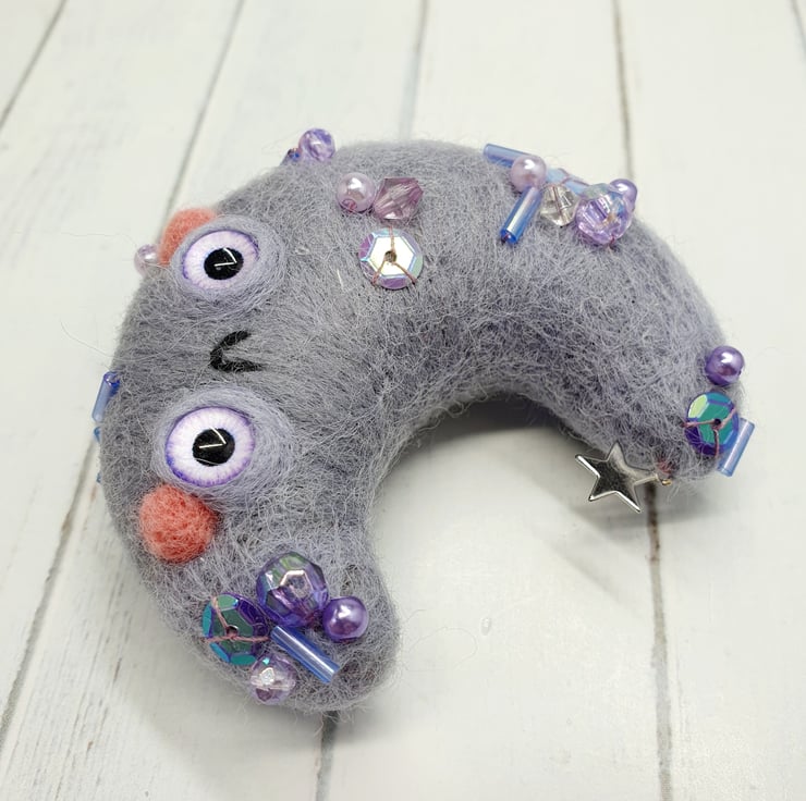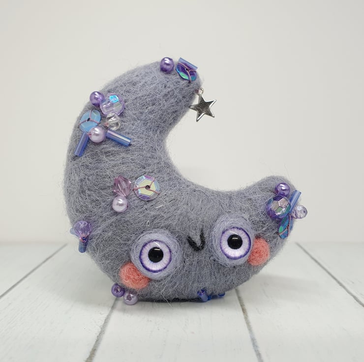 Needlefelted crescent moon with glass eyes and rosy cheeks. This little moon has various beads and sequins hand sewn into place and a little silver coloured star. Moon comes with a transparent loop hanger attached and measures roughly cm tall and cm across. This is a one of a kind design.
