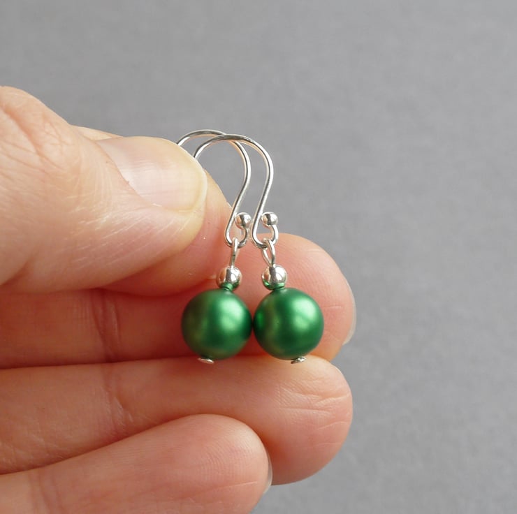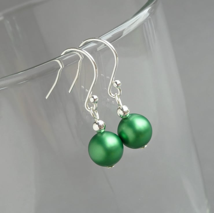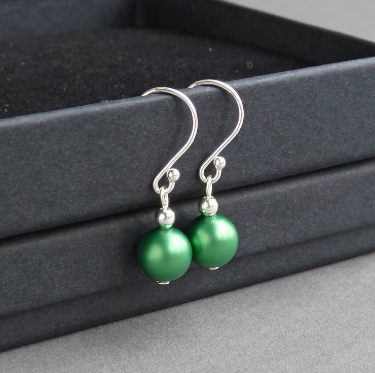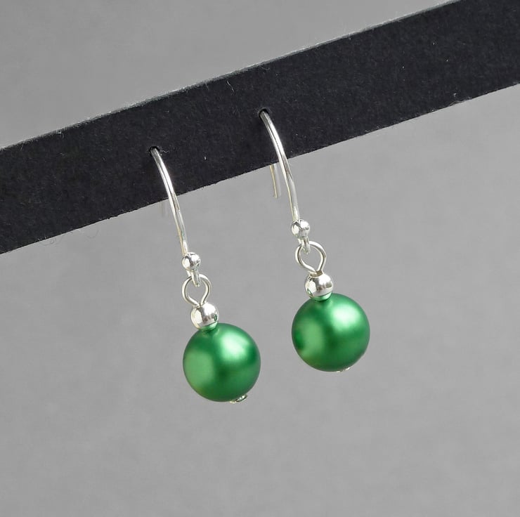 These pearl drop earrings are created using 8mm bright green pearls. Their simple design make these dangle earrings perfect for wearing everyday or for completing your outfit for a special occasion. As each pair arrives individually gift wrapped, these dangly earrings make perfect gifts for bridesmaids in an emerald green themed wedding.
