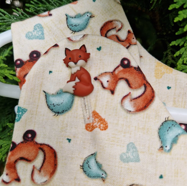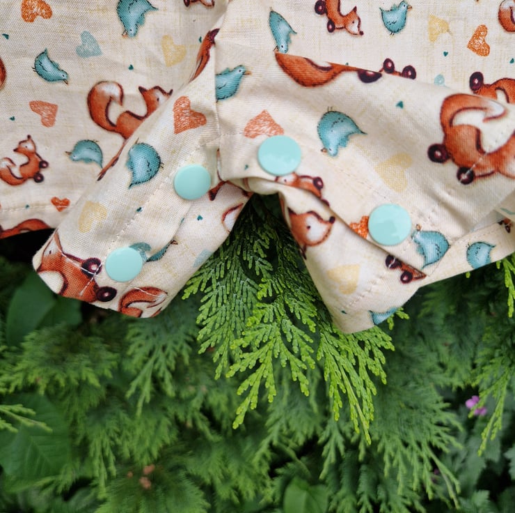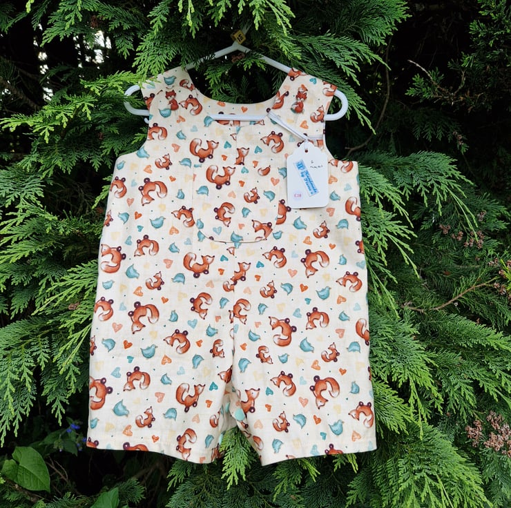 Age 6m approx, pair of cream rompers with a print of cartoon foxes, turquoise blue chickens and hearts and a centre feature chest patch pocket detail, with plastic fox shaped buttons and turquoise poppers at the gusset for easy opening for nappy changes.
