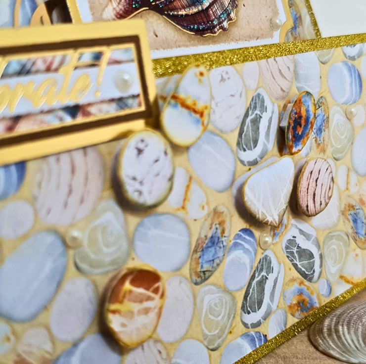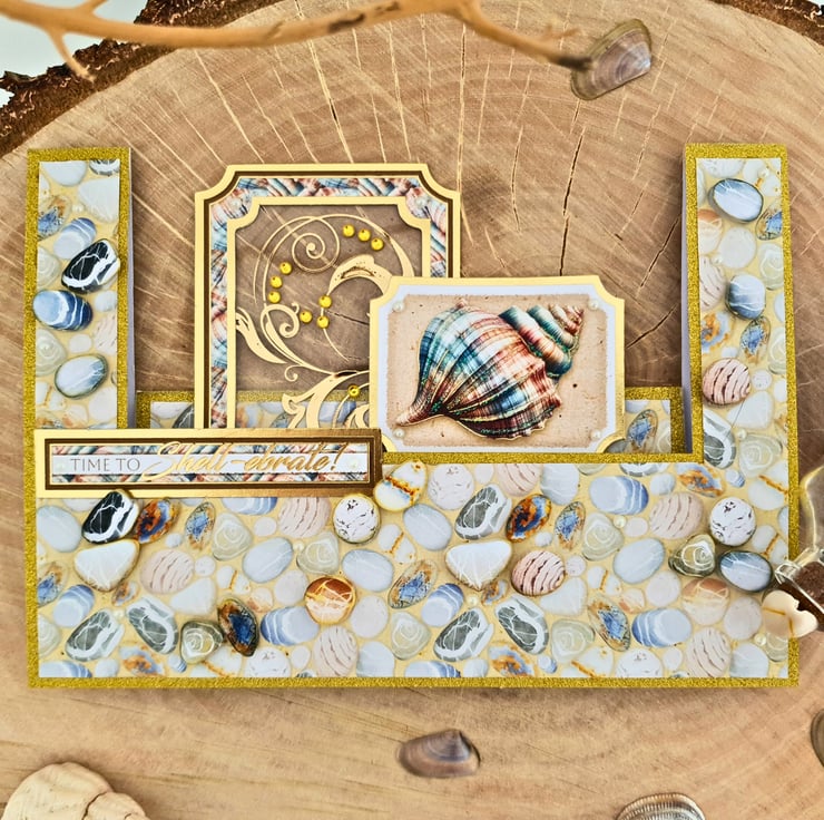 It consists of white card base layered with gold glitter paper & luxury paper printed with pebbles on the sand. 2 gold foiled toppers decorate the middle step, 1 decorated with gold foiled acetate & yellow gemstones & the other displays the picture of a seashell, embellished with glitter colour drop for extra shine. A sentiment strip on the front step reads "Time to shell-ebrate", playing with the word "celebrate". The card is also decorated with raised decoupaged pebbles for dimension, & small white pearls. It is finished with a matching insert paper at the back, that has been left blank for you to add your handwritten wishes.