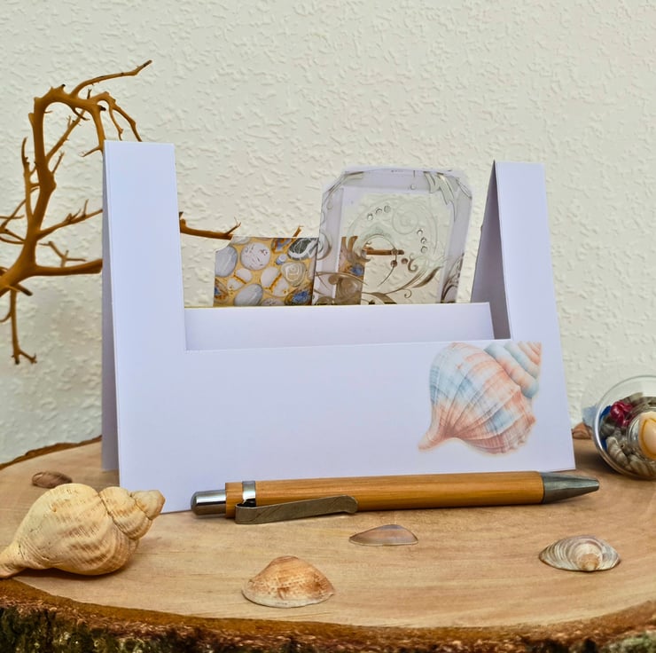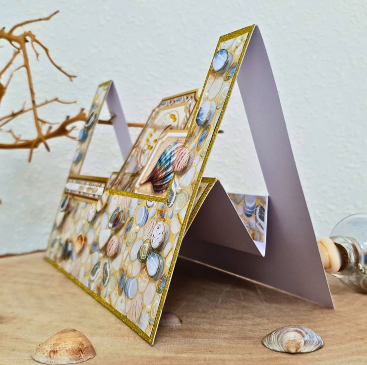 A handmade, beach themed keepsake card for many occasions with seashell & pebbles. It is a fun fold stepper card & its summer theme & general sentiment make it suitable for birthdays, work promotions & so on.