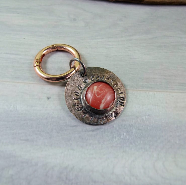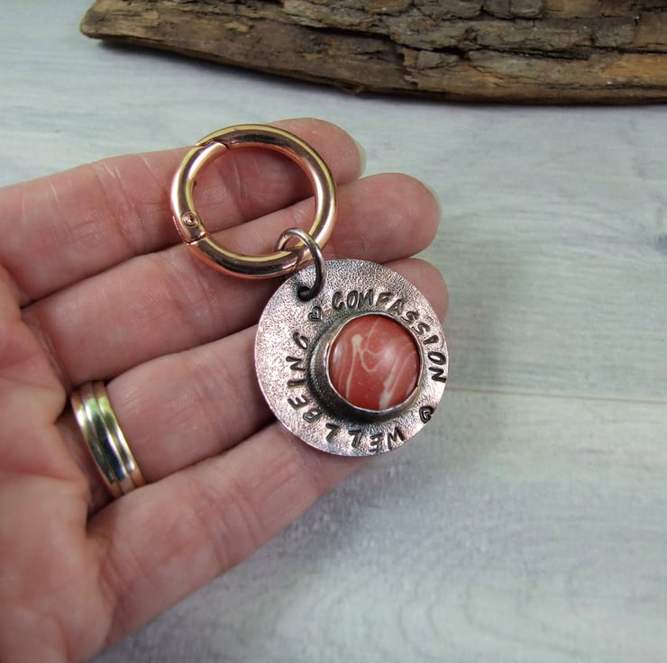 Keyring, Copper and Rhodochrosite Bag Charm. Hand stamped with compassion and wellbeing. 7th Wedding Anniversary Gift. Can also be worn as a pendant necklace.