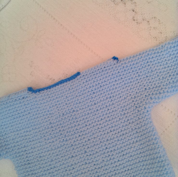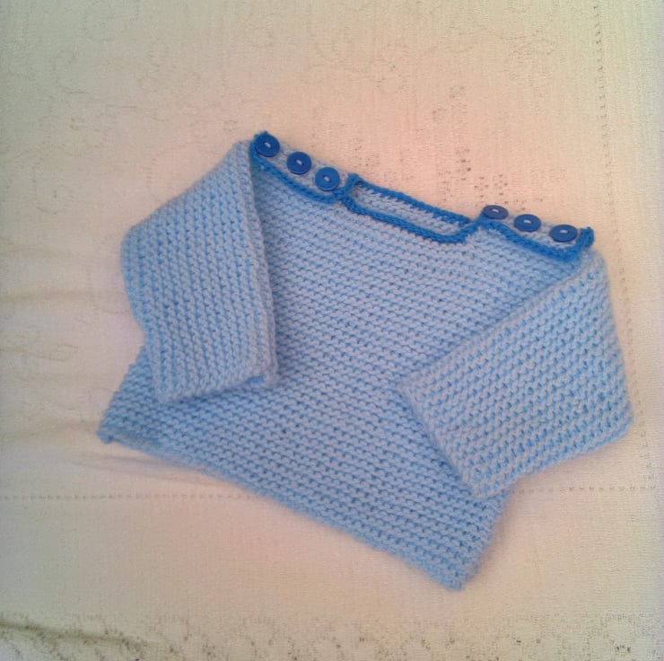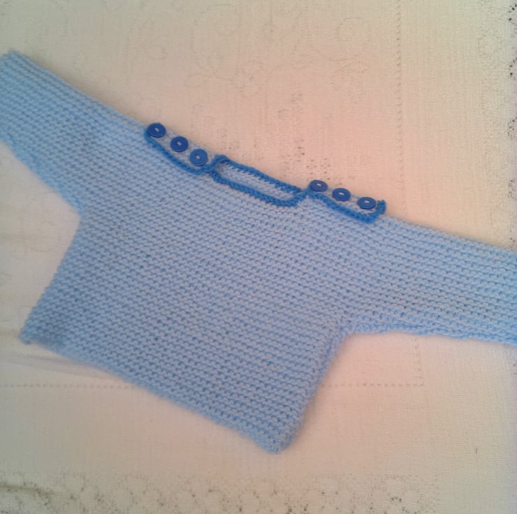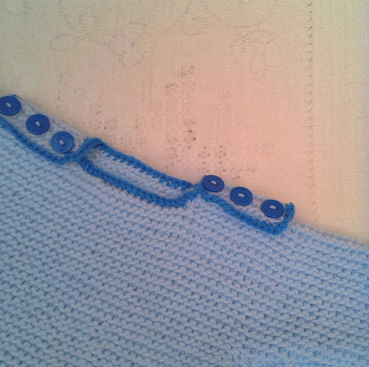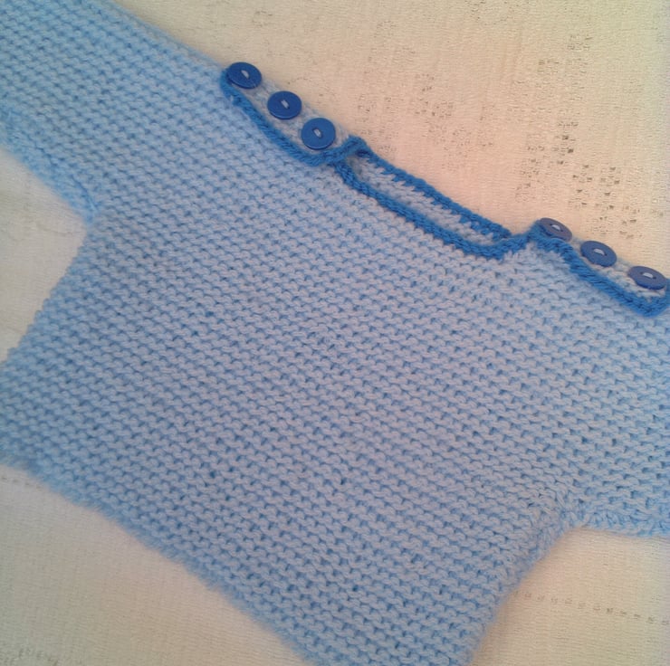 The jumper is in stock in this lovely pale blue double knitting yarn with a bright blue edging, to fit a 0 - 3 month old baby with a 14/16 inch chest. The jumper is fastened at each shoulder by 3 buttons. The jumper can be made in other colours and sizes for you, please state the colour(s) required when you order and the available sizes and prices are shown below. The processing time for this set will be 1 - 2 weeks to produce and post to you.