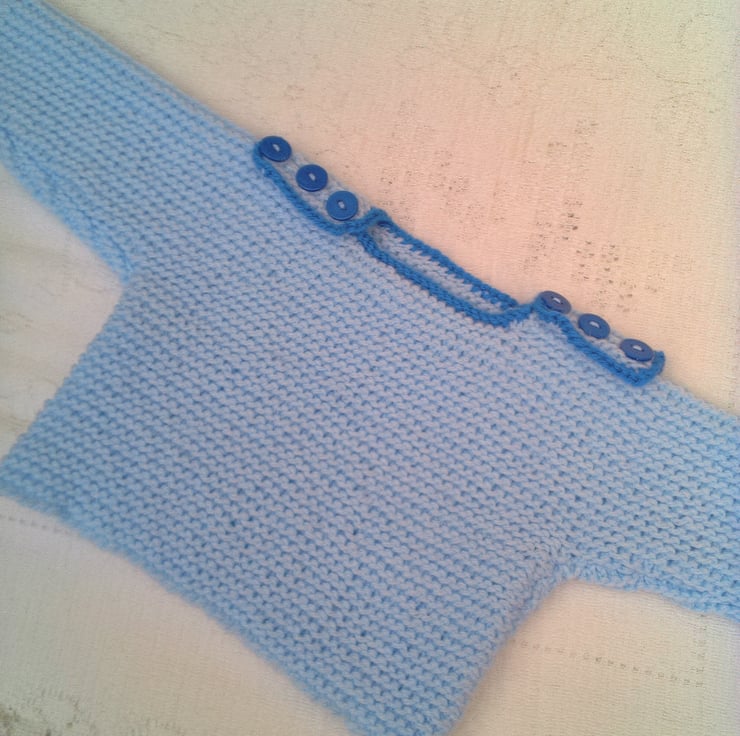 A cute and practical baby's unisex jumper is hand knitted in a . It would make an ideal gift for a new baby or a baby shower or a lovely treat for your own little one.