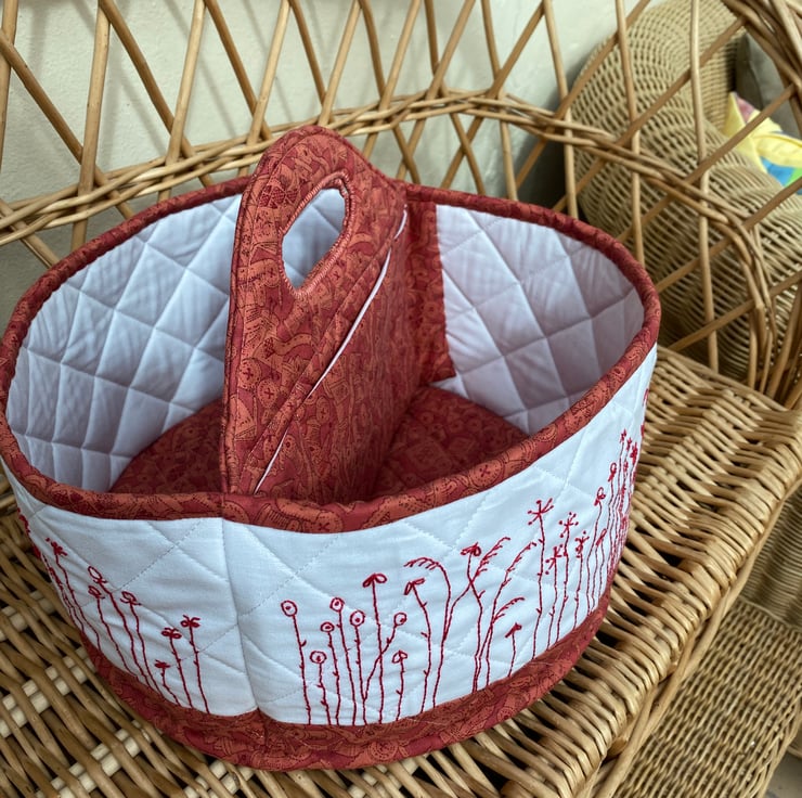 The white, outside panel is hand-embroidered with a nice array of wild flowers in red-work and then quilted in a diamond shape. The rusty red fabric has a sewing theme and makes a nice contrast to the white. There are no raw edges and this fabric basket measures 6” deep and 10 1/2” in diameter and will be packed as shown to save any creasing.