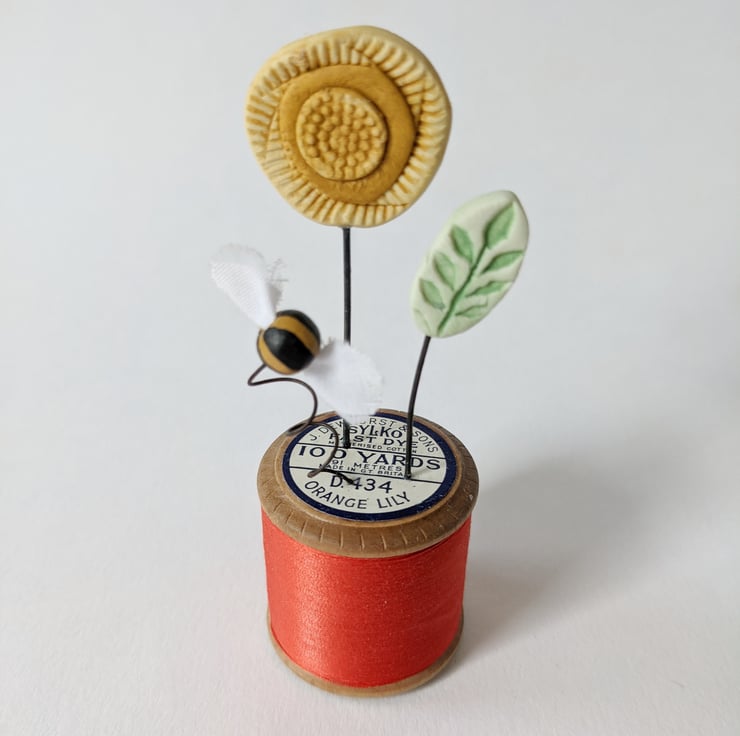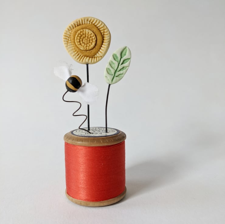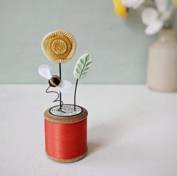 A handmade little wooden bee buzzes by pretty clay flowers standing in a vintage wooden bobbin.