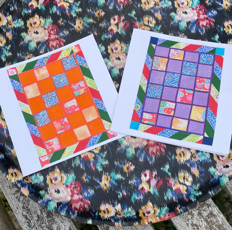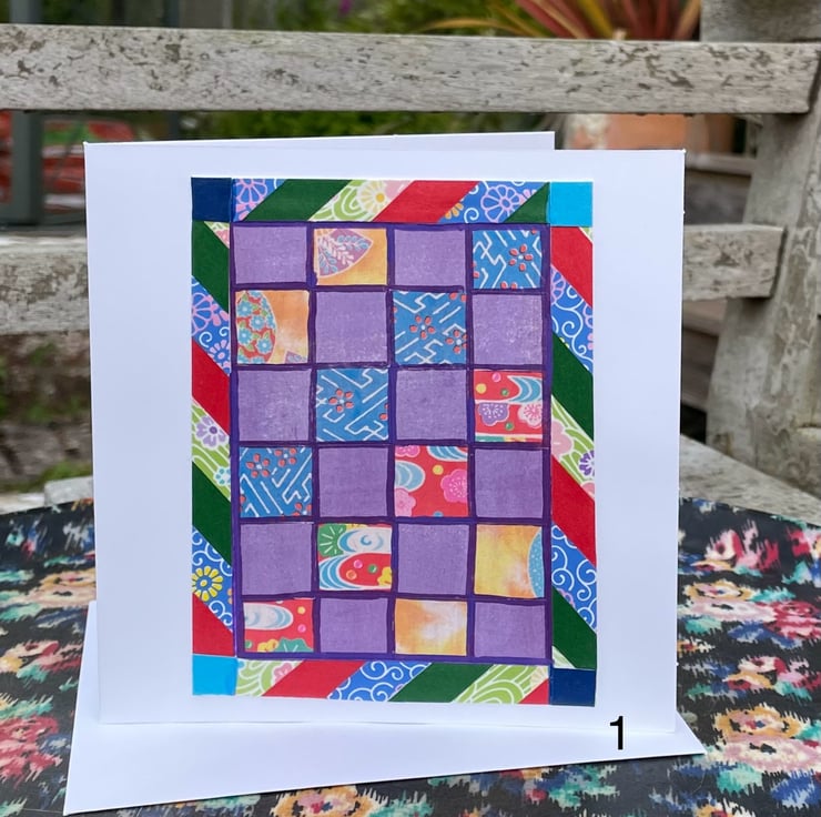 The card motif is a hand pieced collage based on a classic patchwork squares design.