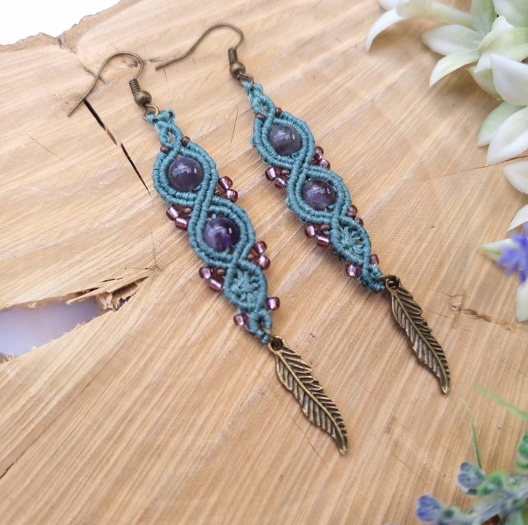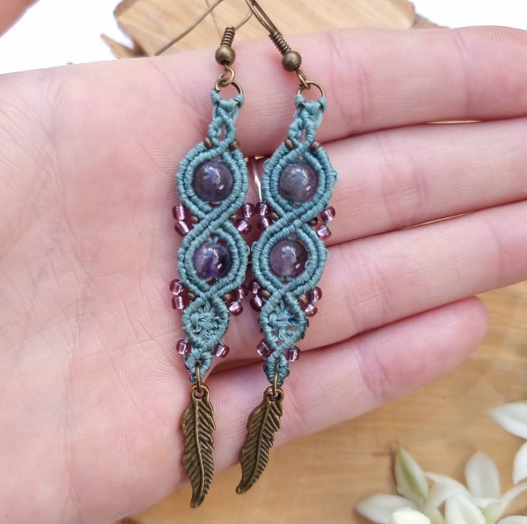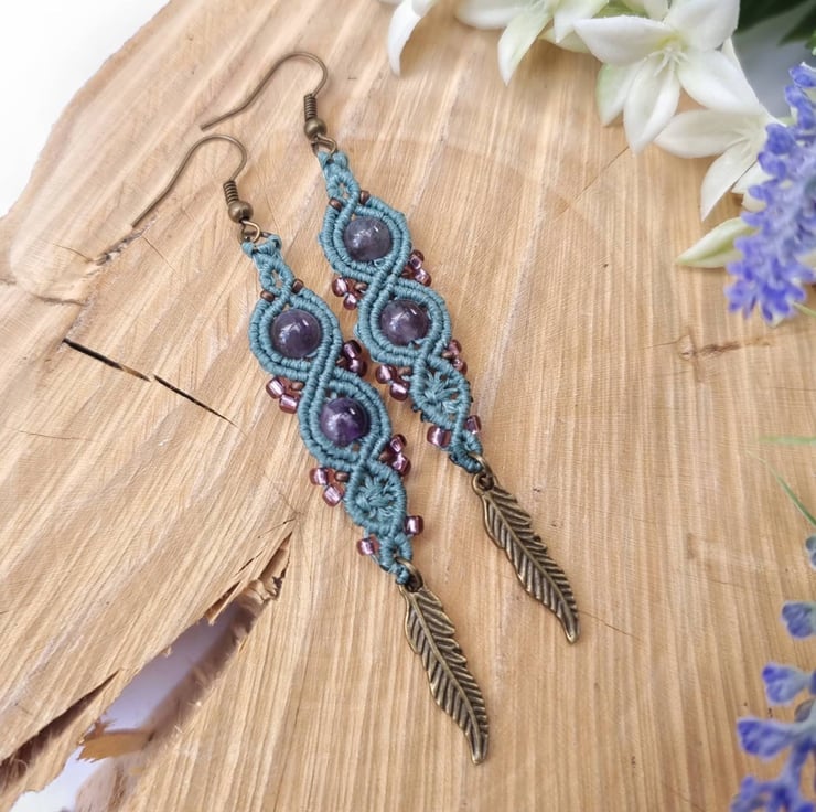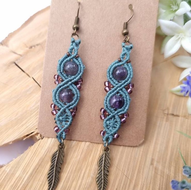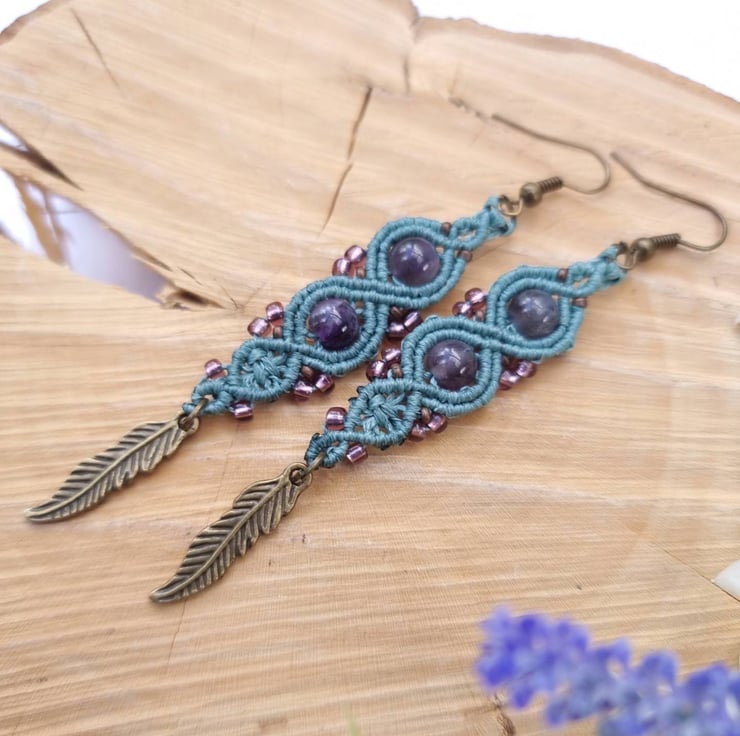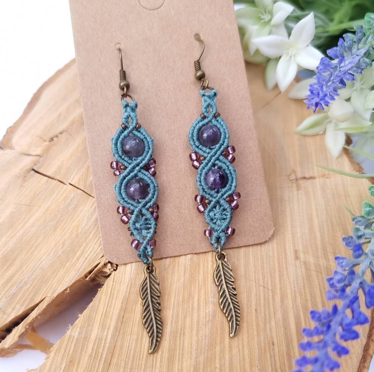 Explore the beauty of our stunning micro macrame dangle earrings, adorned with Amethyst gemstone beads.