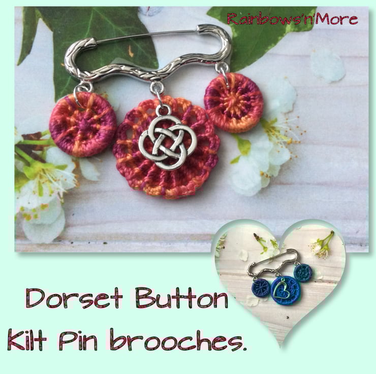 I have attached them with jump rings to a silver coloured wavy kilt pin. I have also added a Celtic Knot charm with the centre button.
