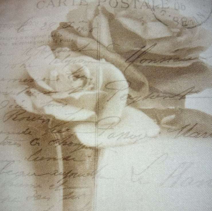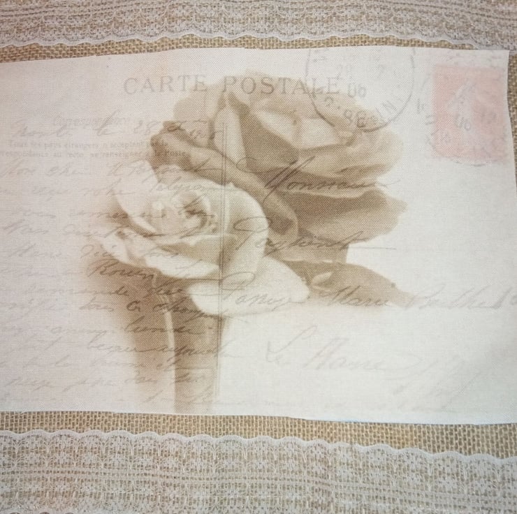 It measures approx 28x21cm (approx A4 size). I used photo editing to merge a French postcard featuring beautiful handwriting, with a glorious rose image, all professionally printed on a 250gsm soft canvas.