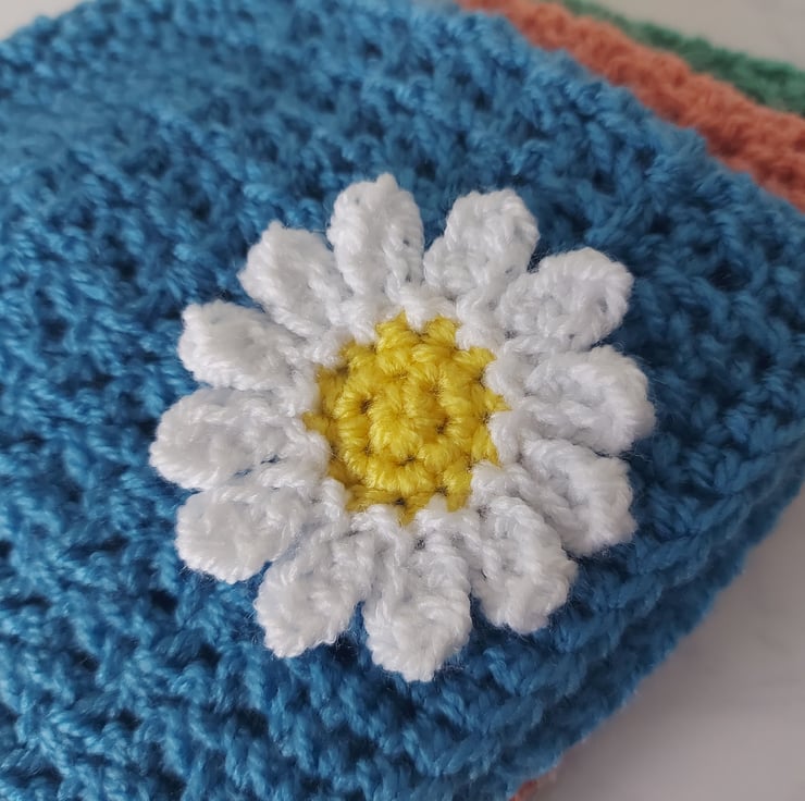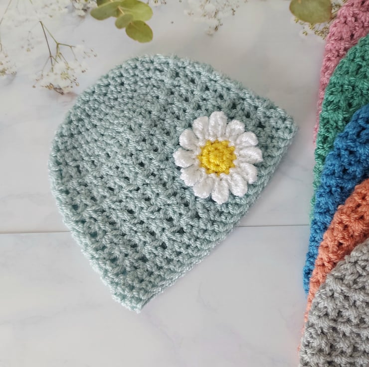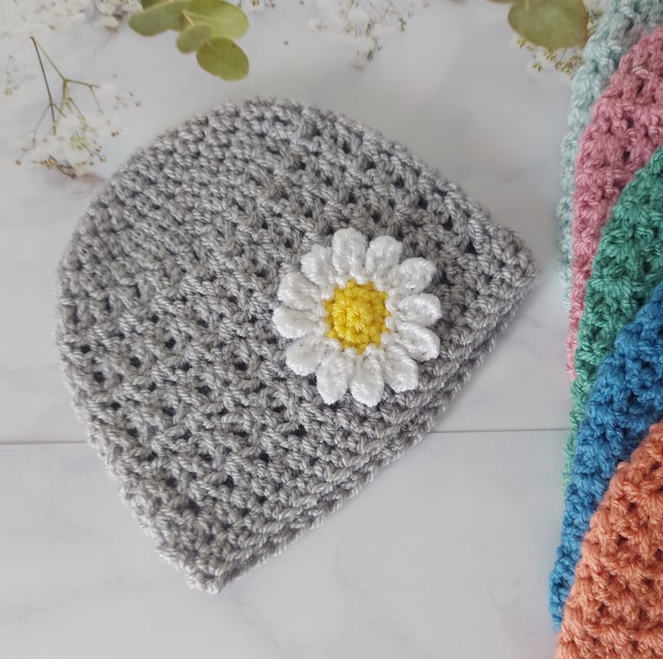 This adorable handmade crochet baby beanie is perfect for adding a touch of charm and warmth to your little one's wardrobe. Made with soft, high-quality yarn, this beanie features a delicate white daisy with a sunny yellow center, creating a cheerful and cosy accessory for any season.